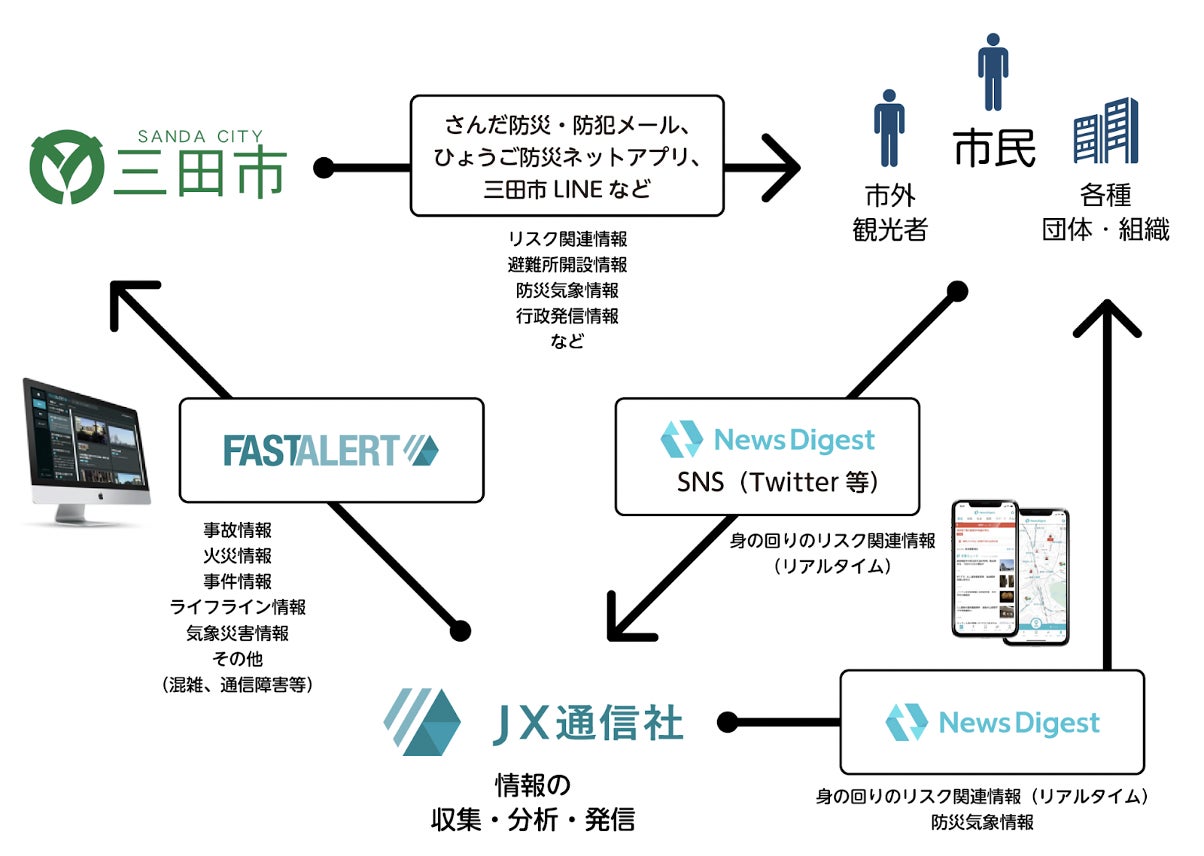 その取組みの一環として、JX通信社が開発提供しているSNS災害情報収集サービス「FASTALERT(ファストアラート)」を、三田市災害対策本部事務局運営訓練(2022年7月)で試行的に活用し、災害時におけるSNSとAIの有効性を確認しました。