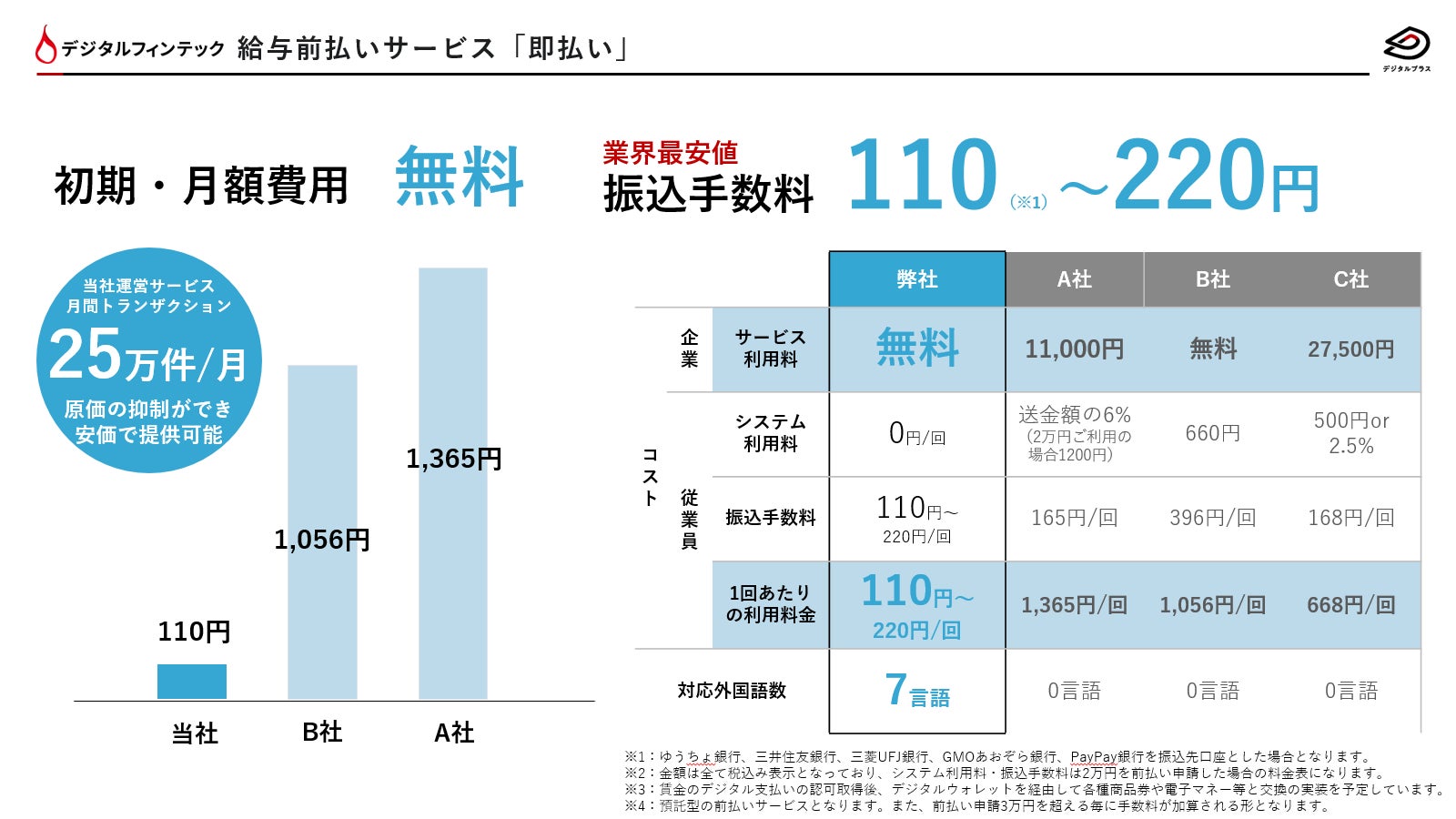 より多くの企業様及び労働者に拡がるようなサービスとし、多様なライフスタイルを支援すべく、企業様に対しては初期費用・月額費用を無料、ユーザーの皆様にも最小110円(税込)のリーズナブルな手数料にてサービスを提供します。
