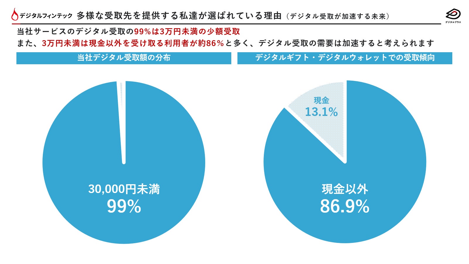 また、即払いによる分割受取となることで小口額面での受取が増え、現金以外での受取ニーズが増えることが予想されます。現に、当社サービスのデジタルギフト・デジタルウォレットでも、 3万円未満の場合は現金以外での受取が全体の85%以上を占めており、小口額面での現金以外の受取ニーズが高いことを示しています。
