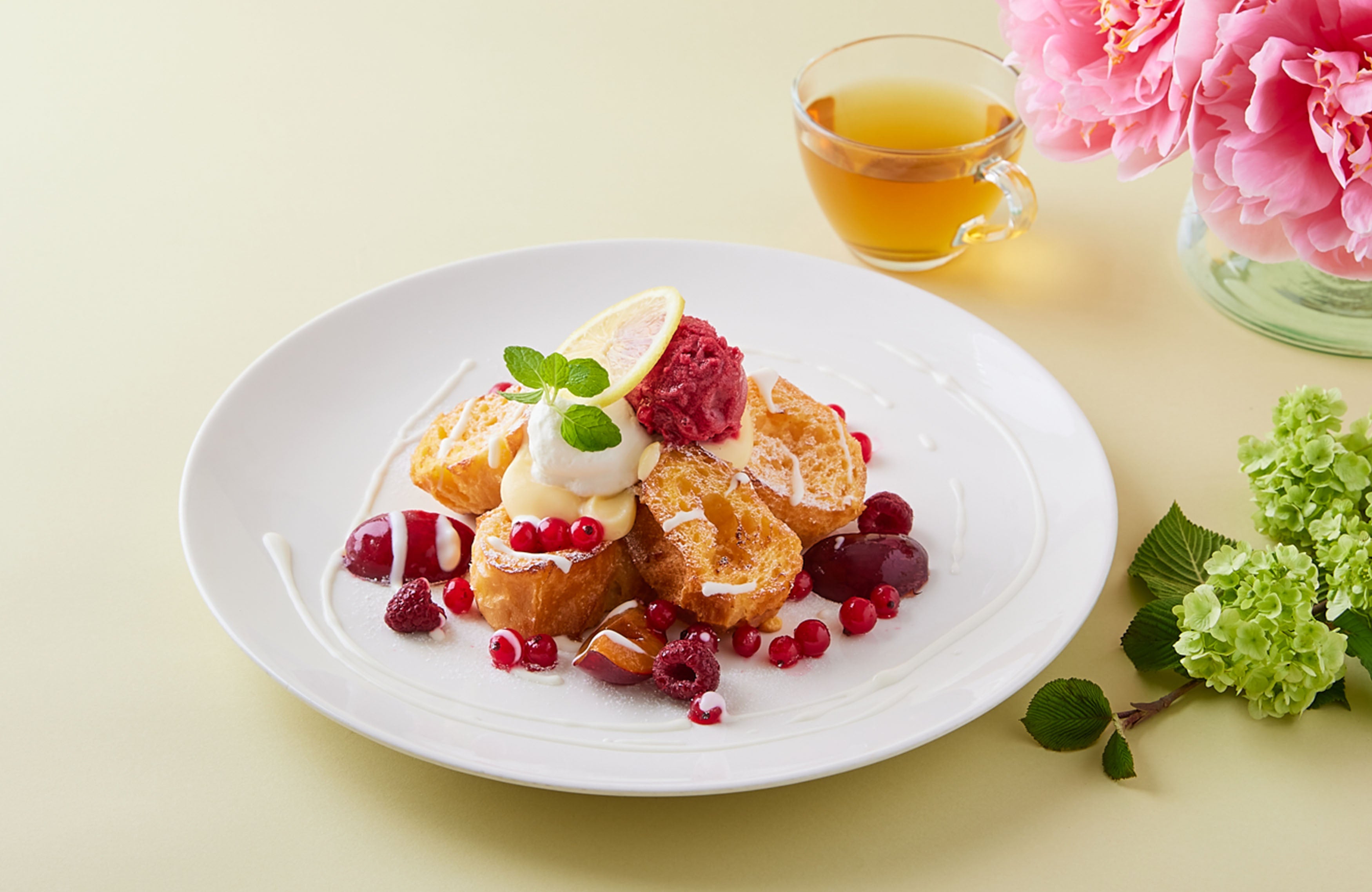 カフェ内でシャクヤクと初夏のグリーンをあわせたブーケレッスンを行い、その後は季節のフレンチトーストをお召し上がりいただけます。