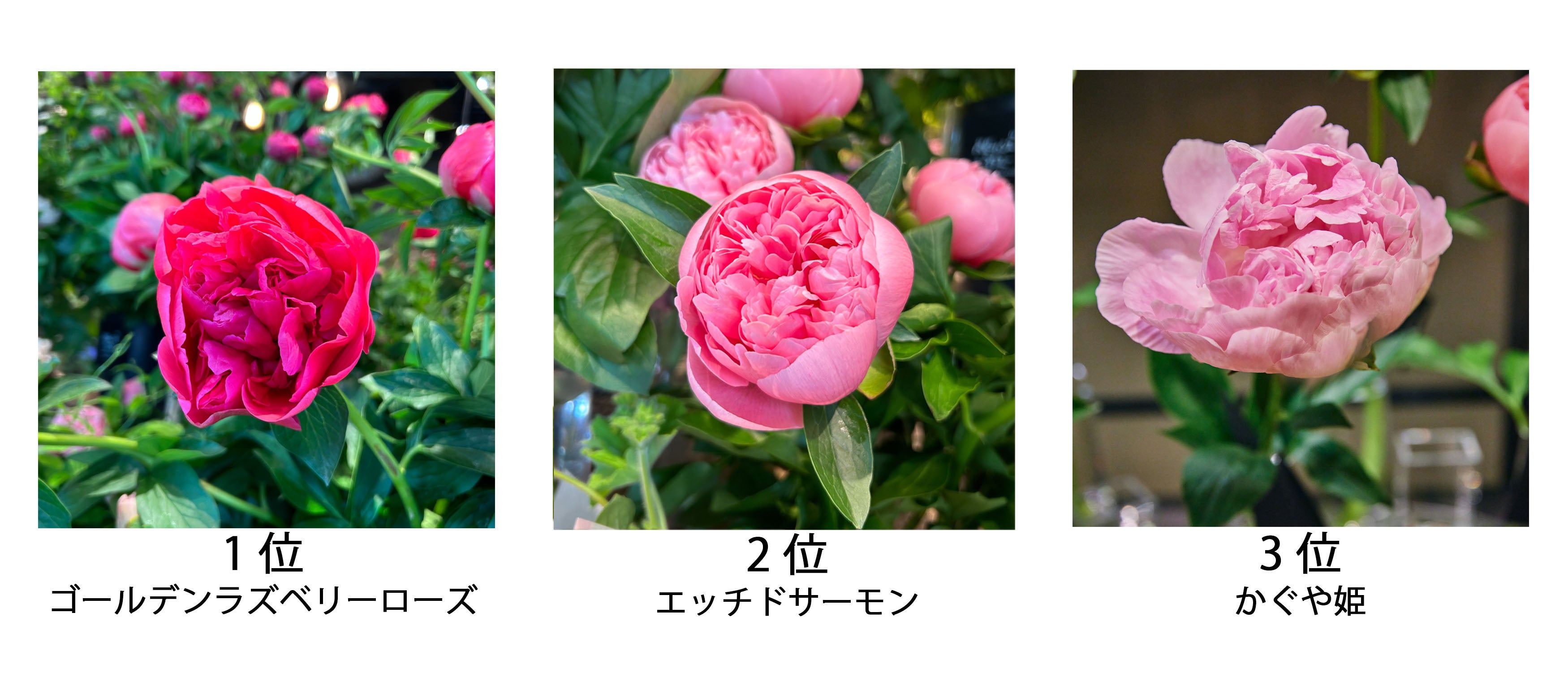昨年行ったシャクヤクの人気品種投票では、1位が「ゴールデンラズベリーローズ」、2位が「エッチドサーモン」、3位が「かぐや姫」という結果となりました。