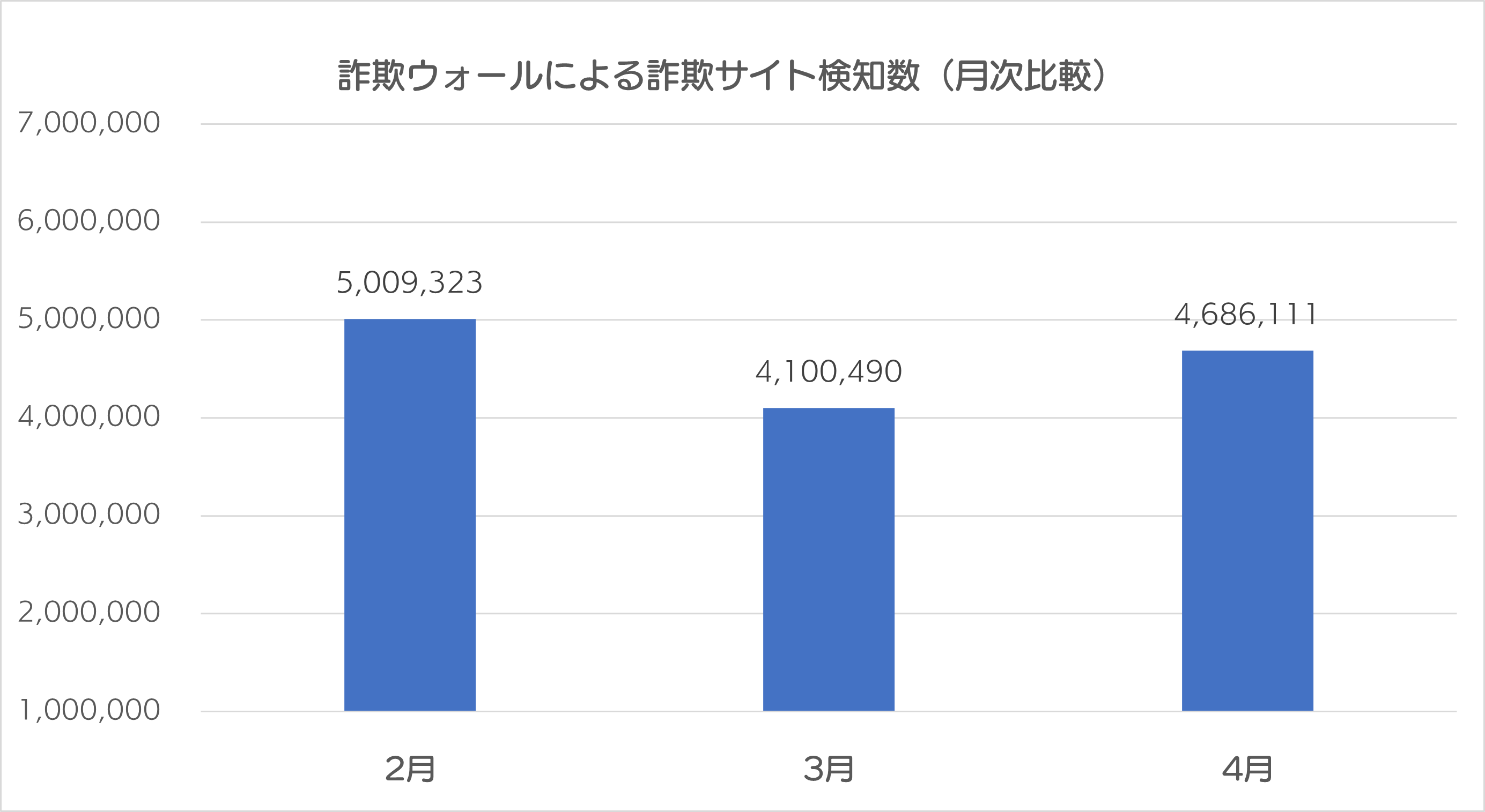 2024年4月の詐欺ウォールによる詐欺サイト検知数は4,686,111件で、2024年3月と比較すると、585,621件増加する結果となりました※。