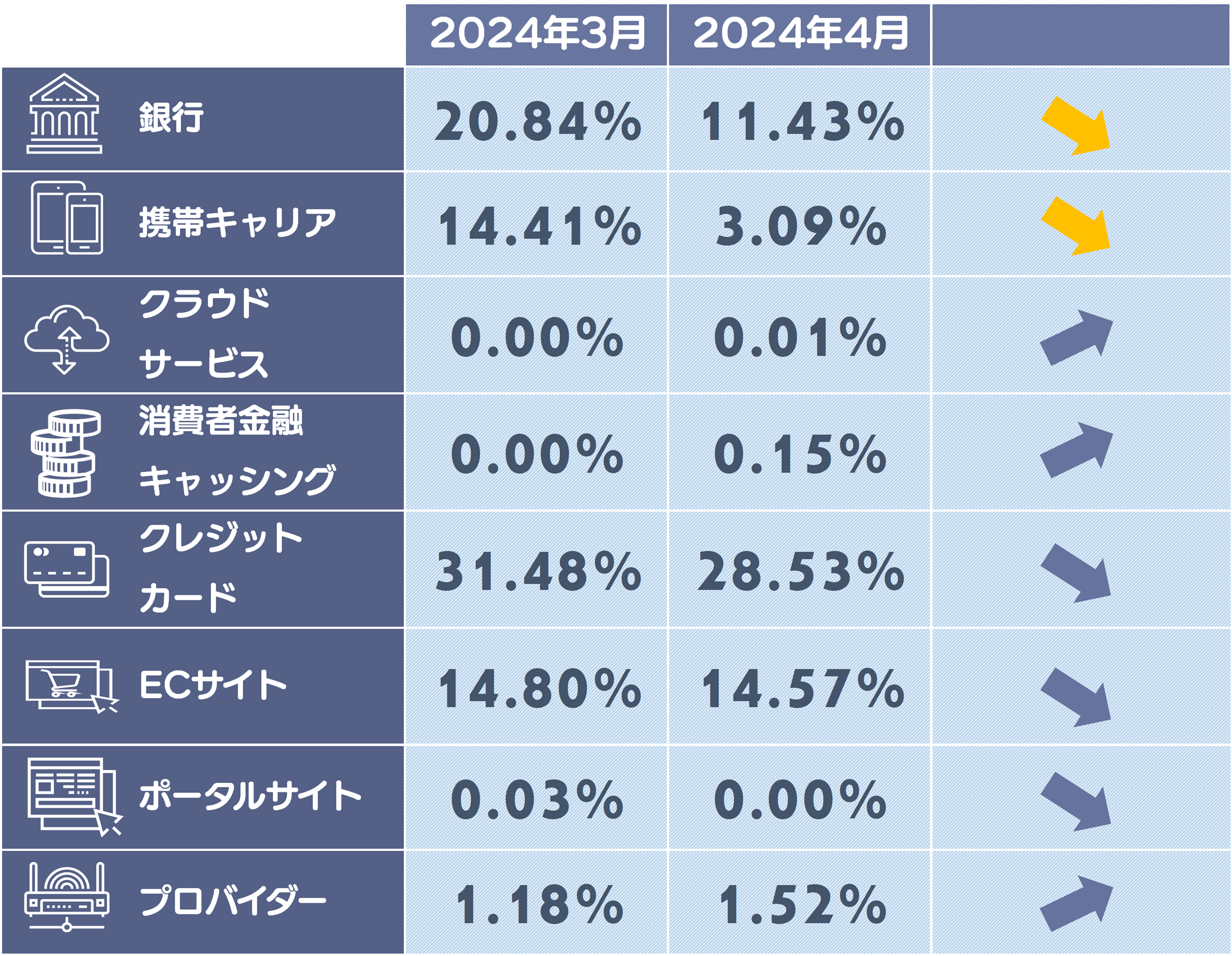 ※5ポイント以上減少したカテゴリは黄色の矢印になります。