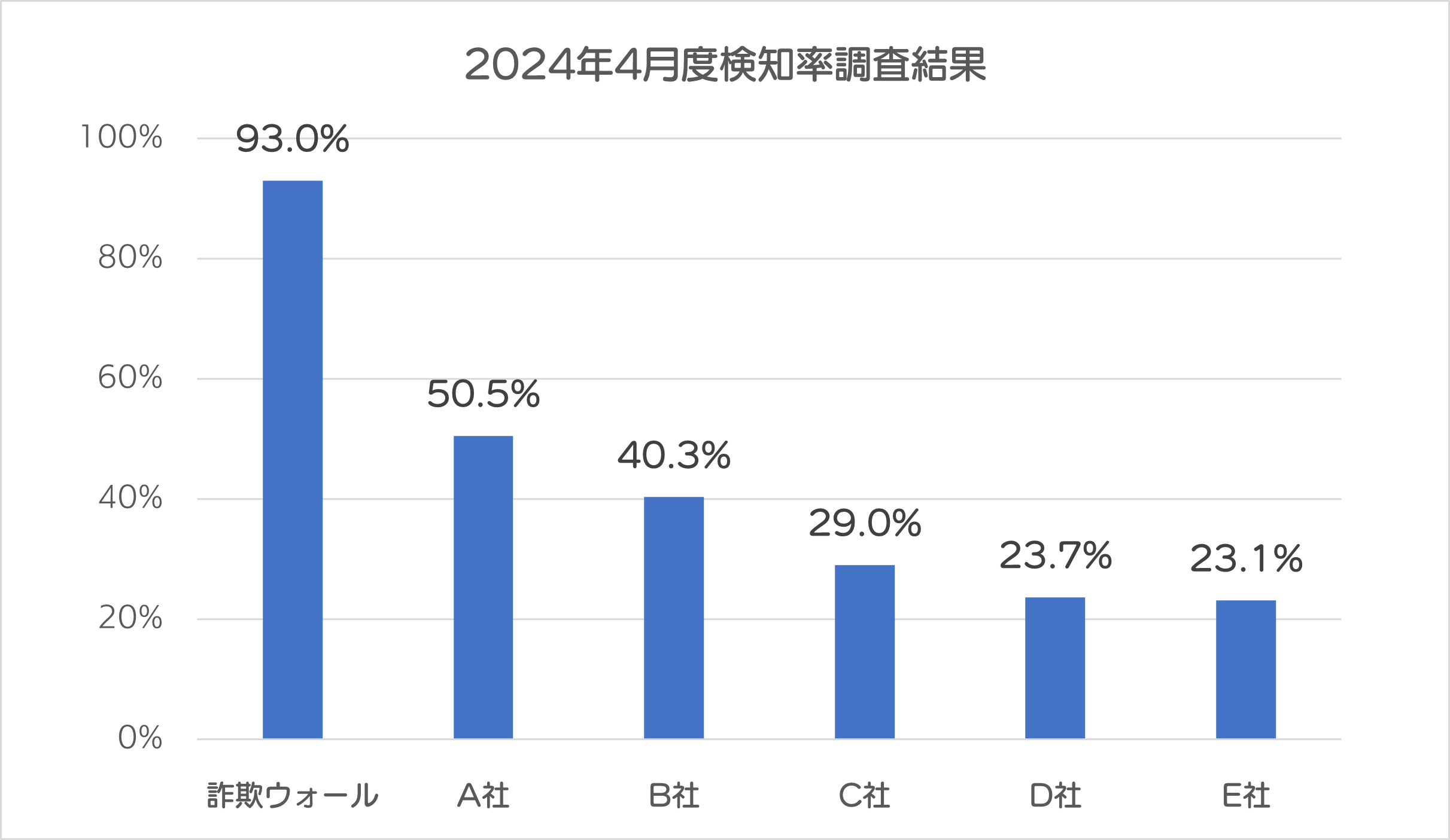 詐欺ウォールを開発・提供するBBソフトサービスでは、公的機関などとの連携によって収集した詐欺サイトURLを利用し、定期的に詐欺サイトの検知率調査を行っています。2024年4月の詐欺ウォールによる詐欺サイト検知率は93.0%と他社と比較し高い結果となりました。