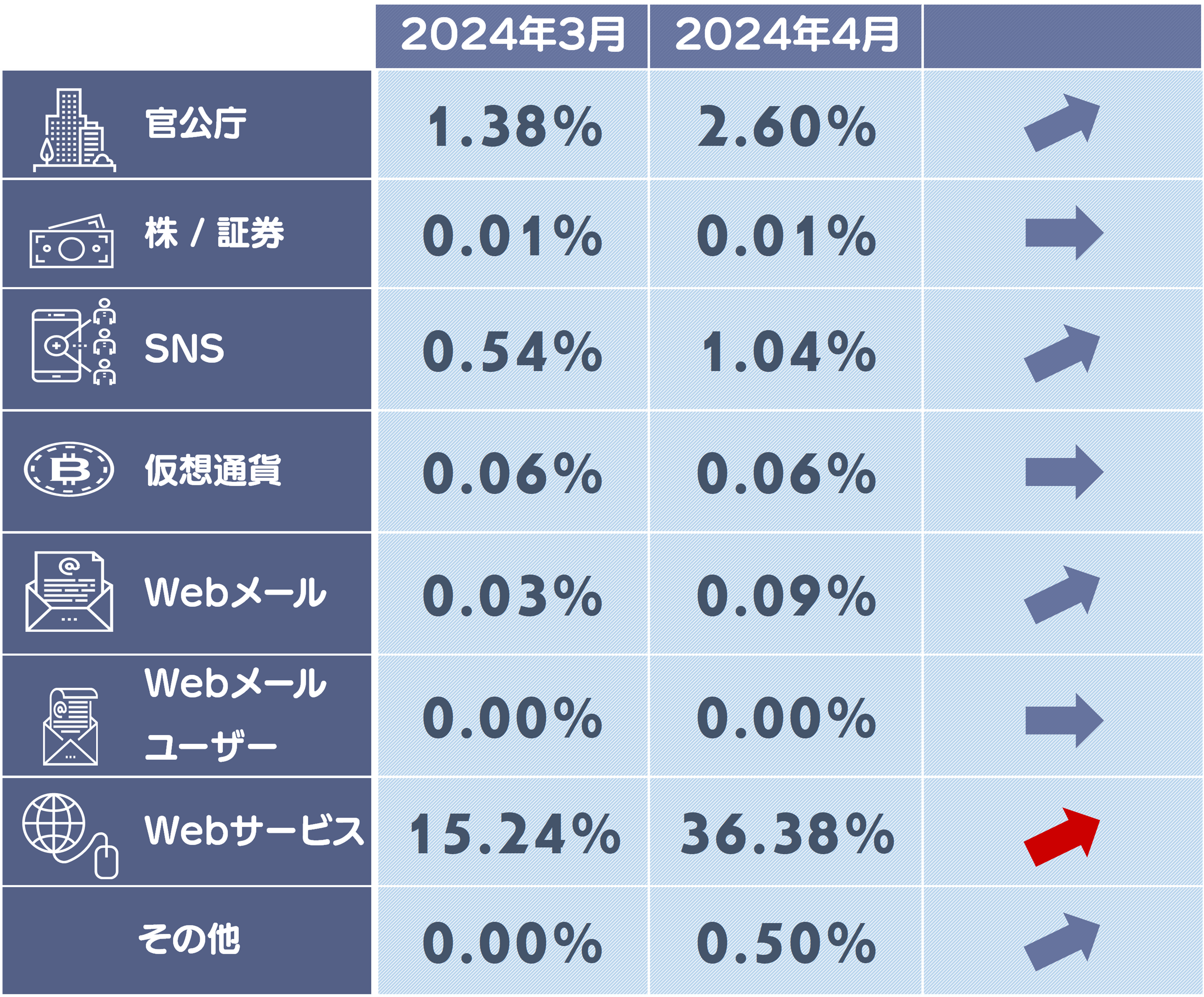 4月度はWebサービスカテゴリの構成比が上昇しています。TEPCO増加に伴い構成比が上昇しています。銀行は9ポイント減少していますが、三菱UFJ銀行の報告数が減少したことが起因しています。ですが高止まりの傾向があるため注意が必要です。携帯キャリアはSoftBankの報告数が減ったことにより構成比が減少しています。