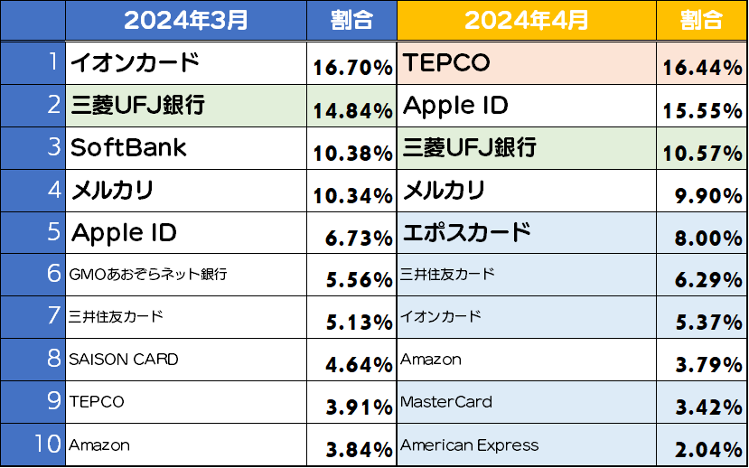 4月度は冒頭で触れたとおり、TEPCOが1位となりました。3位には三菱UFJ銀行がランクインしています。また、クレジットカード系のフィッシングサイトが5つランクインしており、上位10ブランドのうち半数を占めています。