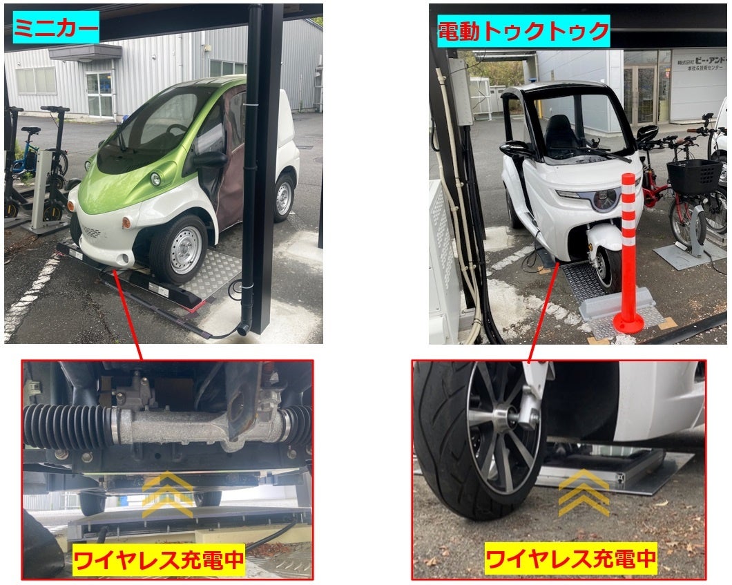 B&PLUSでは電動トゥクトゥクからミニカーなどの小型EV車両を始め、様々なEV向け充電への取り組みを進めています。本社敷地内には、ミニカー及び電動トゥクトゥクのワイヤレス充電を設置、展示しており、自動運用へのトライを進めています。