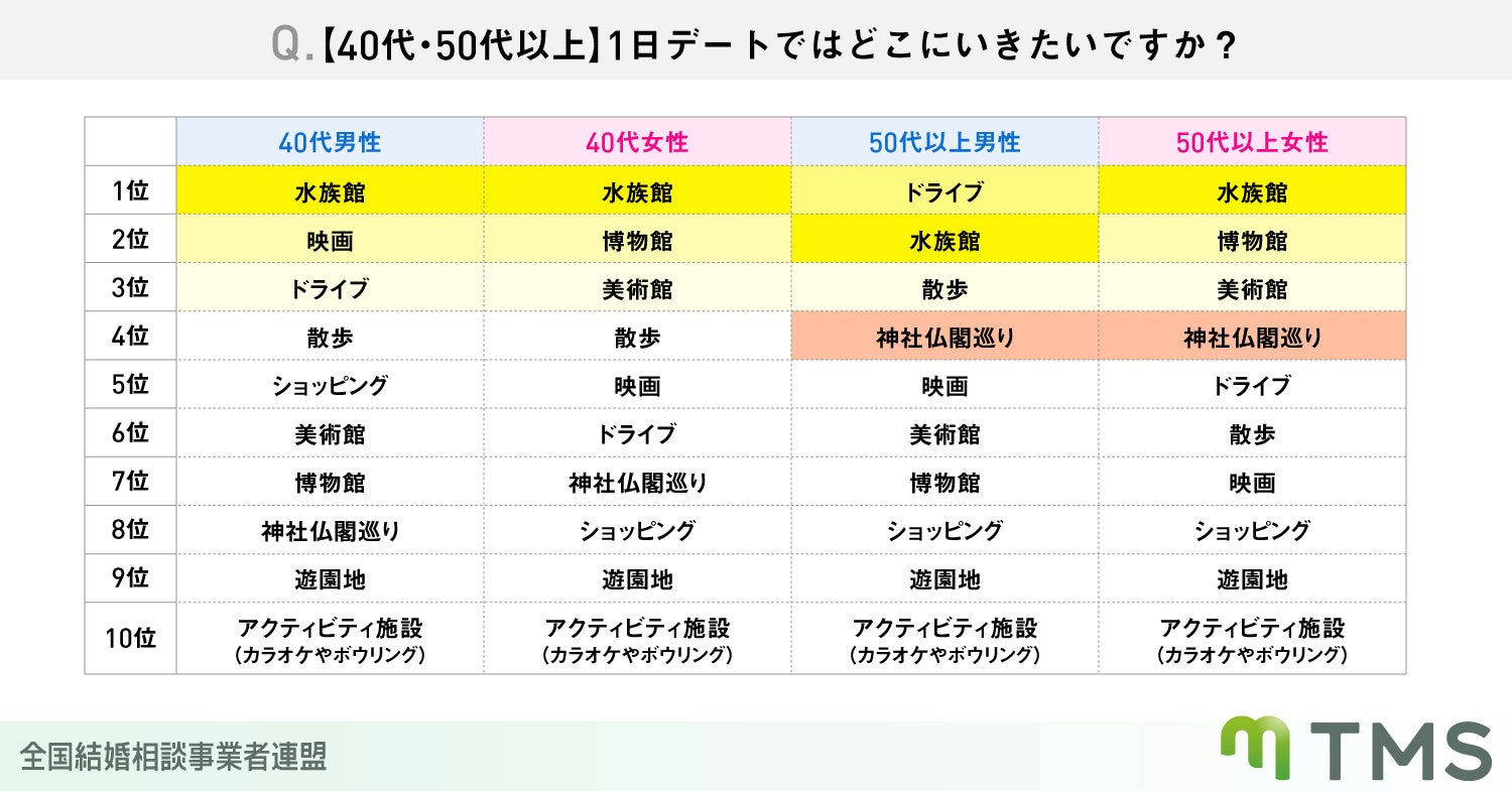 50代以上に関しては男女共に神社仏閣巡りが人気を集め、前回の趣味調査編(https://prtimes.jp/main/html/rd/p/000000131.000010090.html)での御朱印集め人気が彷彿されました。お寺はミドルシニアのデートスポットともいえそうです。