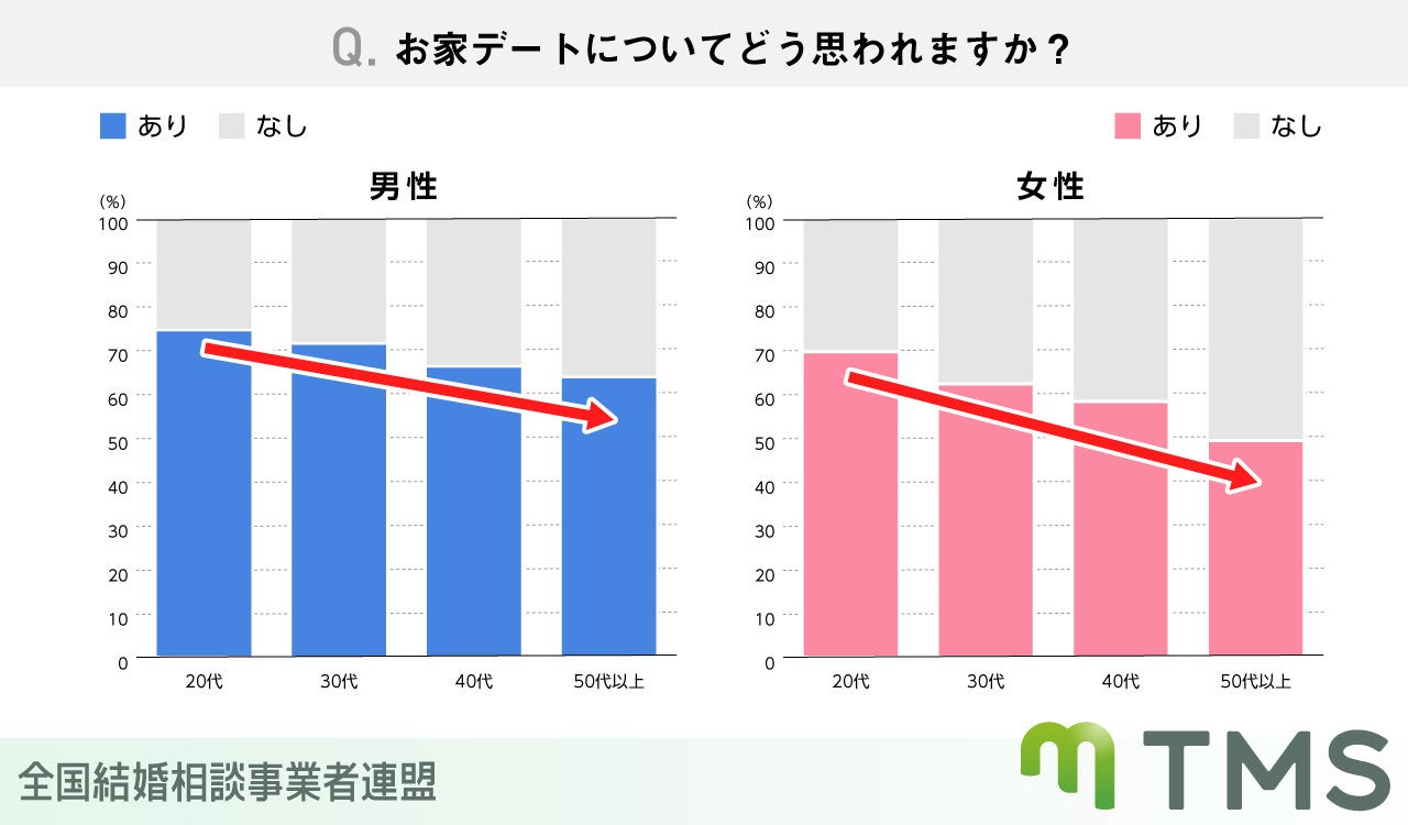 お家デートの受け入れ度については、若い世代の方がより抵抗が少ないという結果になりました。若い層においては、「デートっぽいことをして必ずしもしなくていいよね」というデジタルネイティブ的な考え方があること、また「お金を使わなくてよい」ということが理由として考えられます。