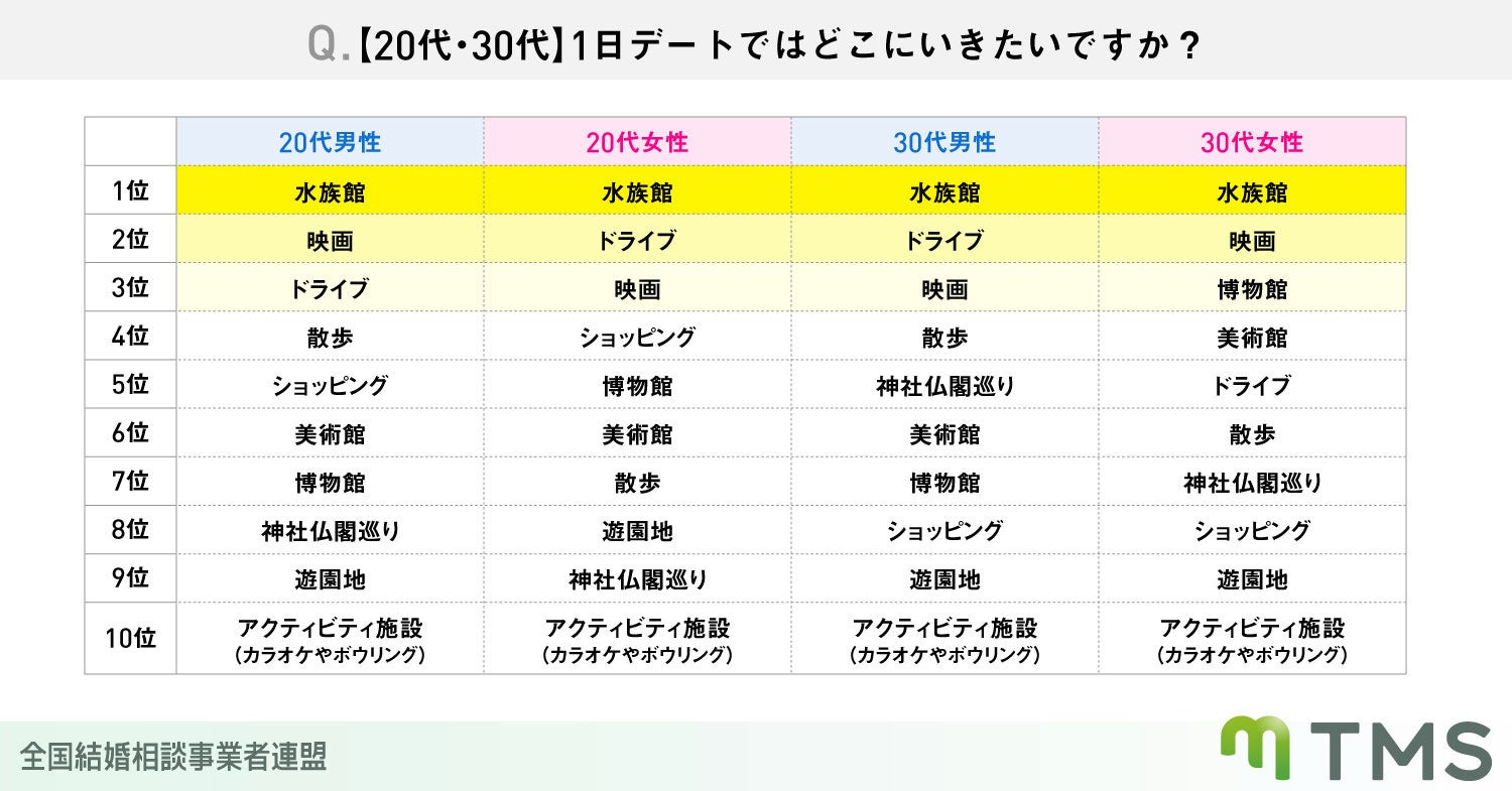 年代・性別問わず水族館が人気という結果に。暑い日も寒い日も雨が降っても大丈夫。生き物を愛でる姿に女子力もアップ。今も昔も定番デートスポットとして不動の人気であることが分かりました。