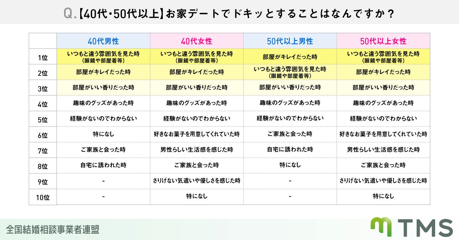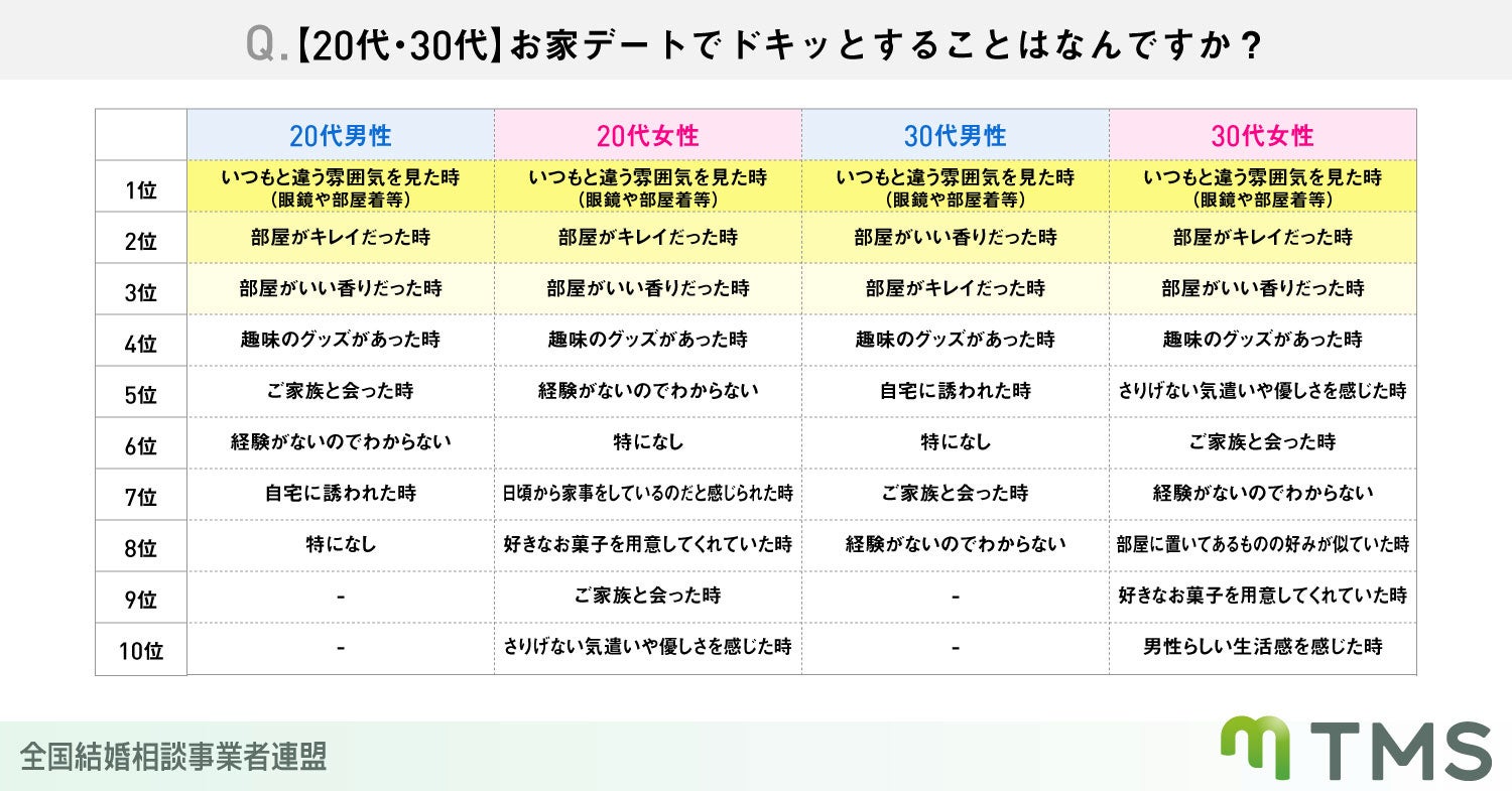 眼鏡や部屋着など普段見たことない自然体の姿を見れたとき、いわゆるギャップ萌えがどの年代でも多く票を集めました。続いて、お部屋の清潔感に関する意見がランクイン。視覚と嗅覚両方に注意!!男性も女性も「清潔感」が本当に重要なキーワードといえそうです。