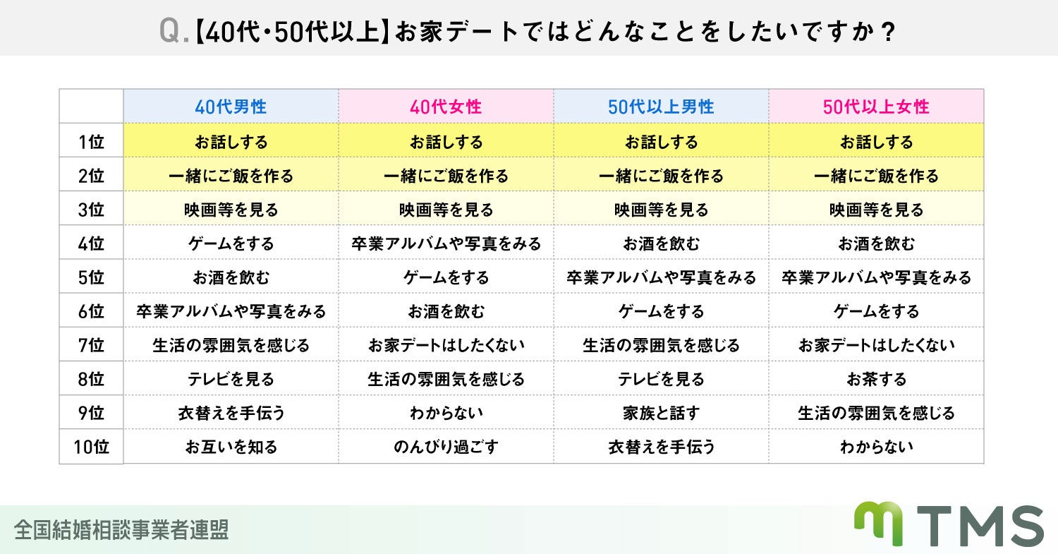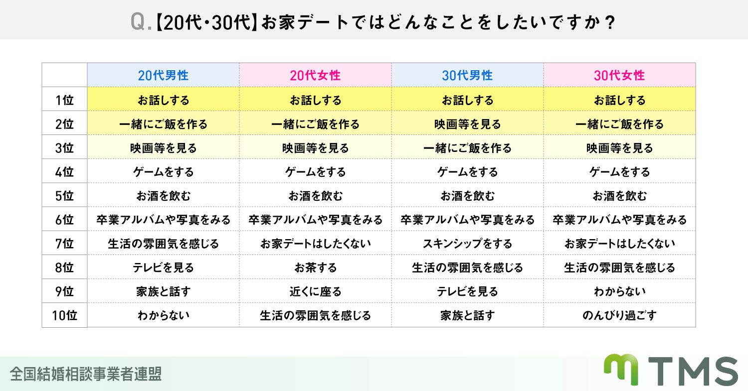 お家デートでしたいことは、年代・性別問わず、「お話しする」「一緒にご飯を作る」「映画等を見る」が上位を占める結果となりました。結婚を前提とした結婚相談所婚活においては、「一緒にご飯を作る」のは、結婚後の生活のイメージを広げるきっかけとなり、人気のようです。