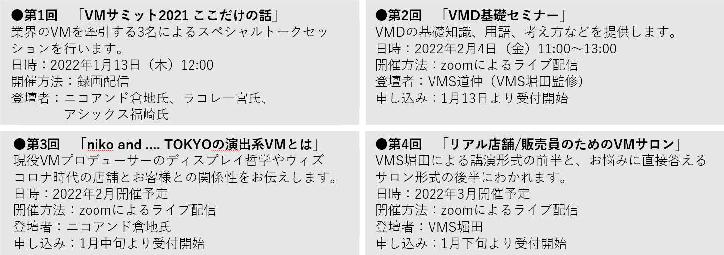 iDAでは販売員の方々に気軽にVMD知識を得ていただくため、VMDを専門とするグループ企業のVMS監修の下、2022年1月~3月に全4回の「VMDセミナー」を開催します。ファッション業界のVMを牽引するスペシャリスト登壇によるトークセッションの他、最新トレンドやアフターコロナのあるべき姿、参加型のオンラインサロンなど、多角的にVMDに関する基礎を学ぶことができます。