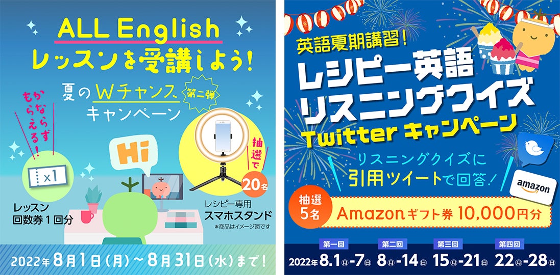 株式会社ポリグロッツ(本社:東京都新宿区、代表取締役:山口隼也)は、英語学習アプリ『レシピー』にて 夏のWチャンスキャンペーン と 英語リスニングクイズTwitterキャンペーンを開催いたします。