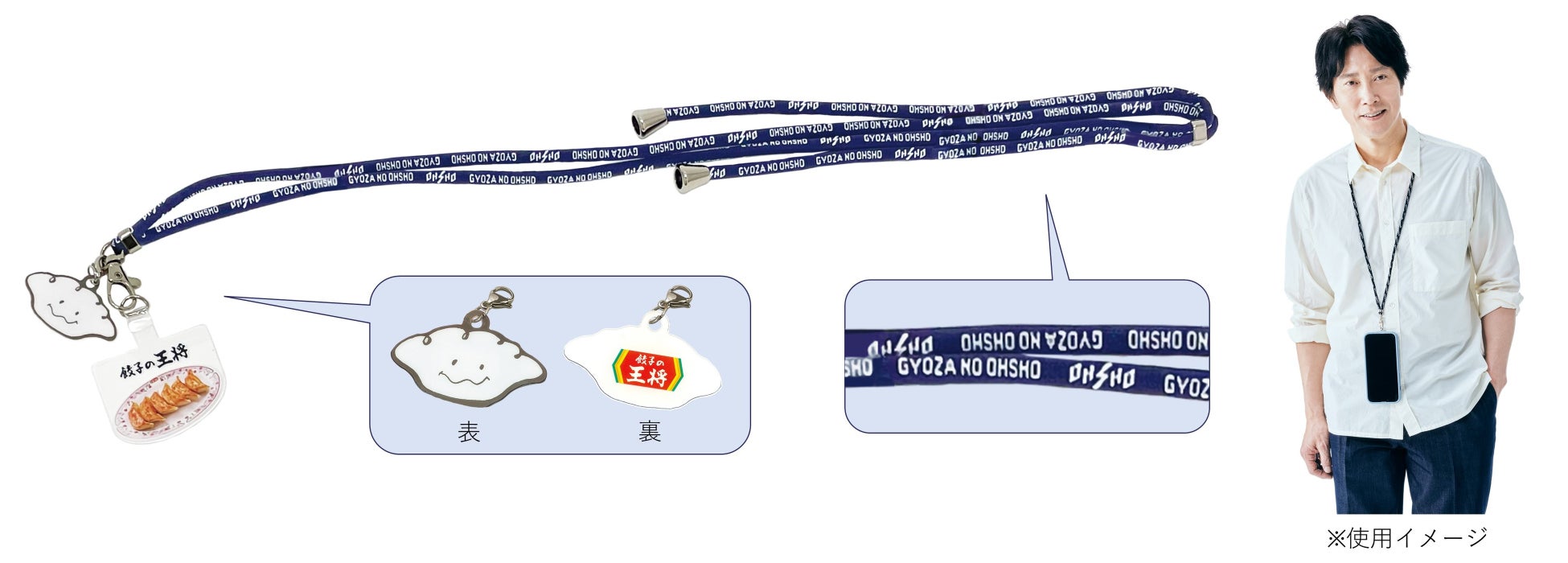 スマホを首や肩からかけられるようになる、便利なストラップ。紐の部分には「GYOZA NO OHSHO」の文字が!