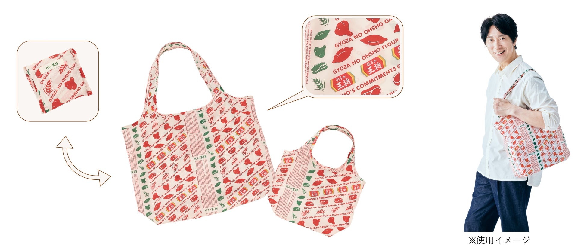 餃子の王将のテイクアウトにもピッタリサイズのエコバッグセット。コンパクトにたたむことができます。