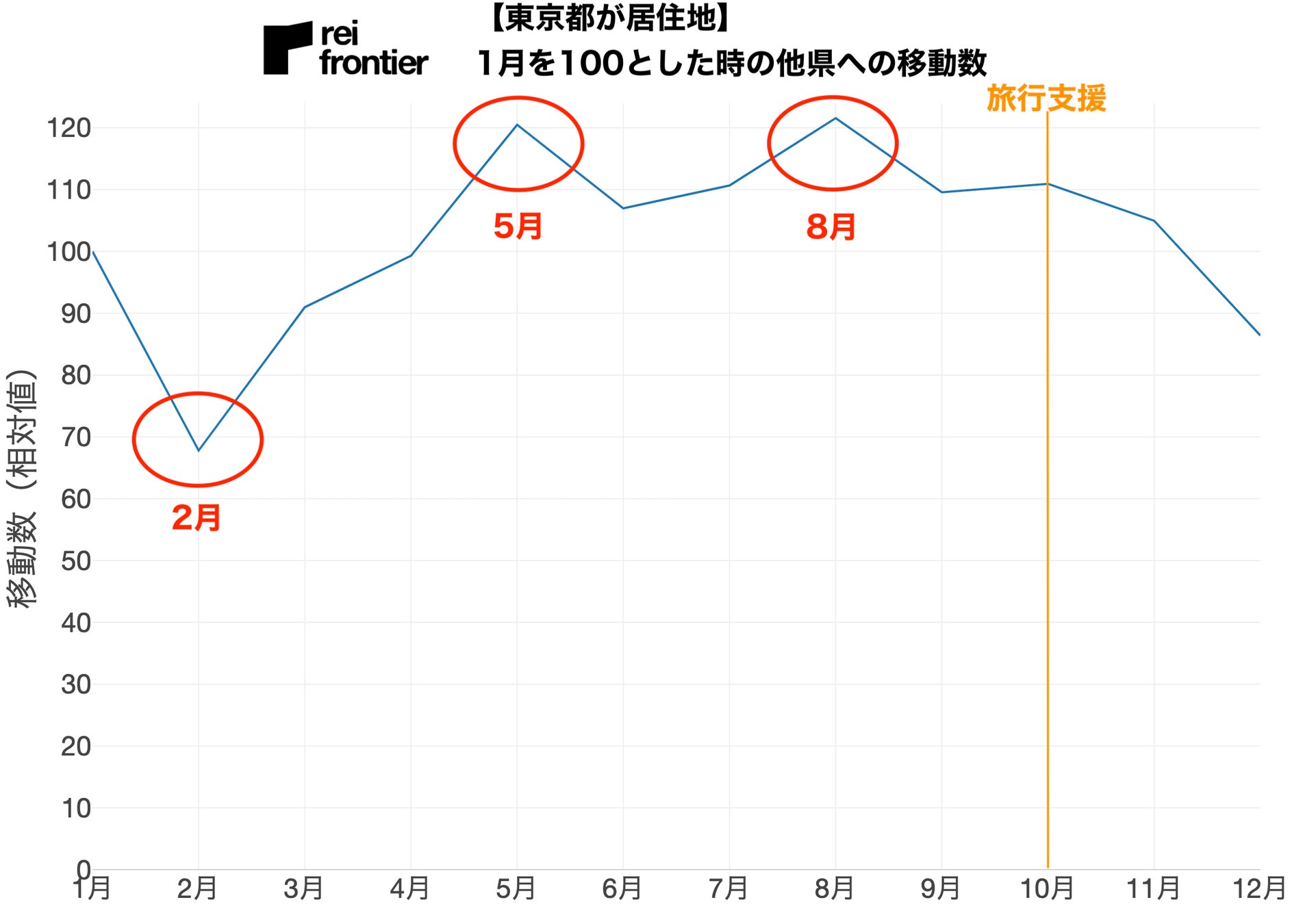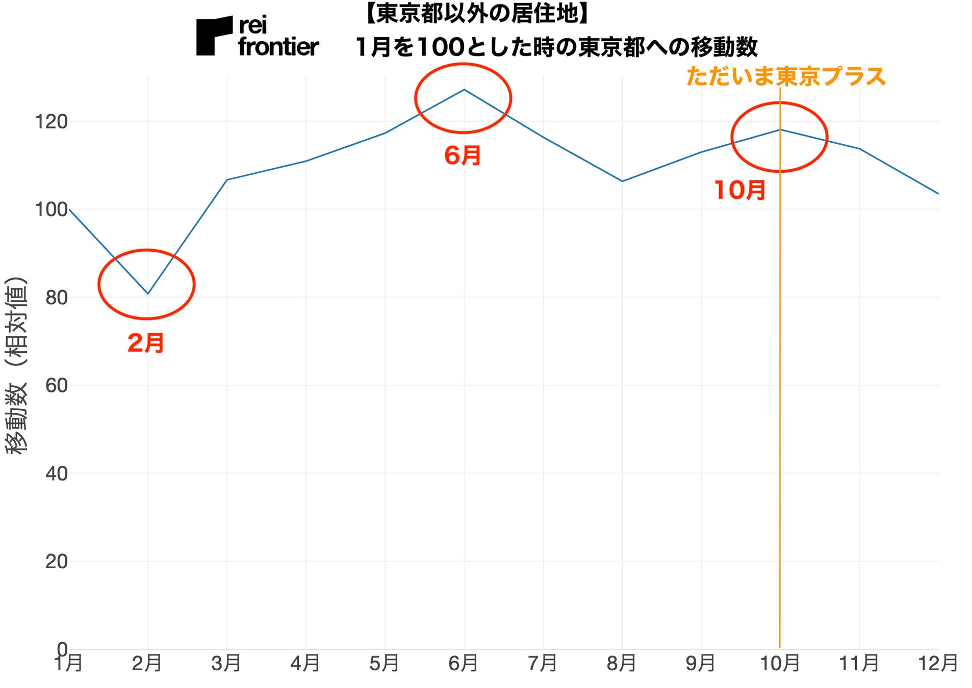 こちらは1月の移動数を100とした時の東京都への移動数になります。