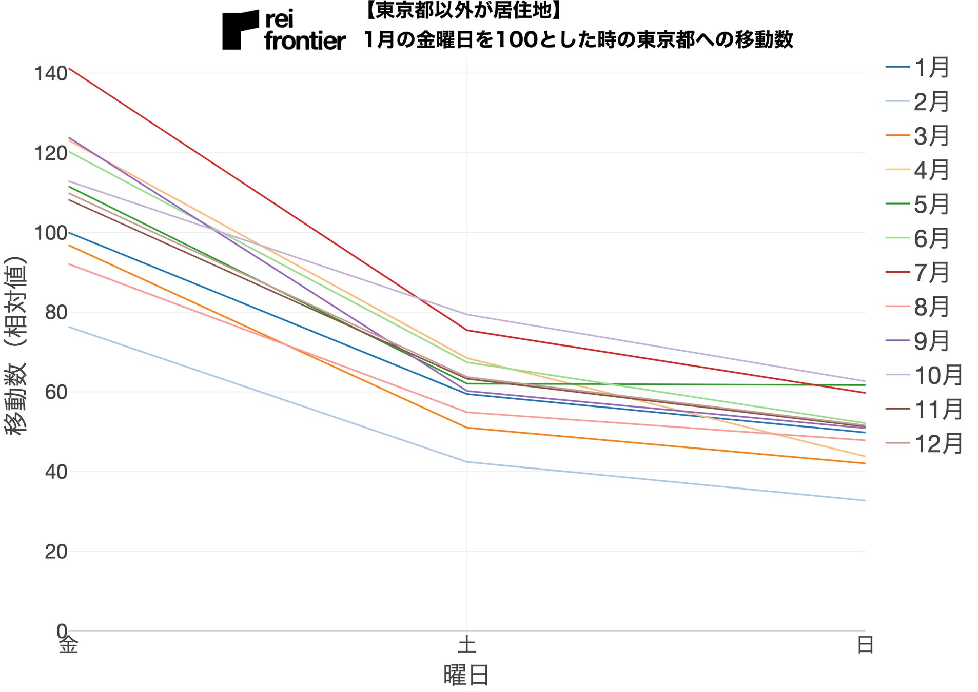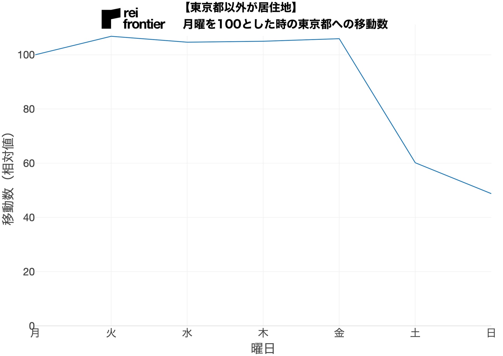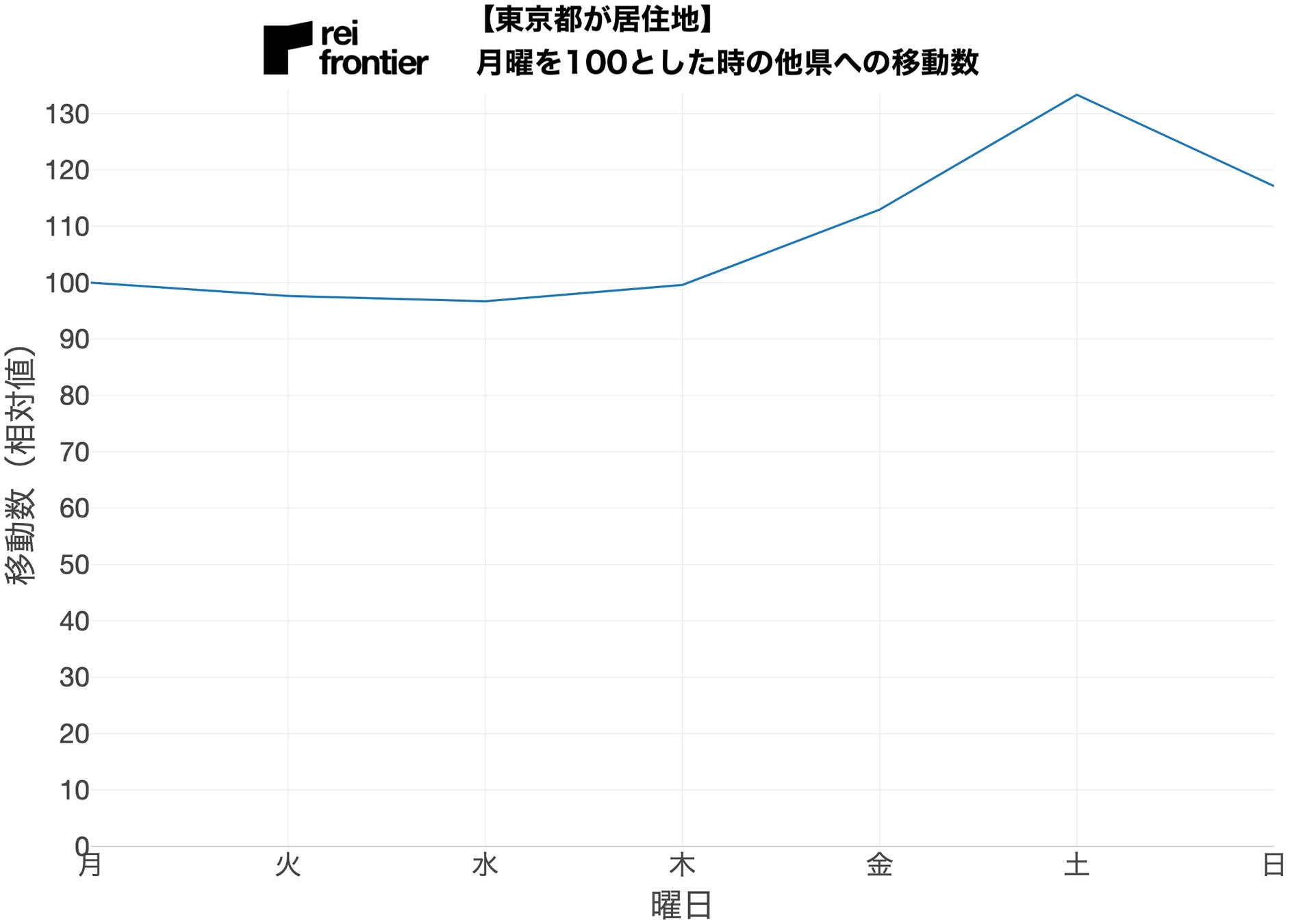 こちらは月曜の移動数を100とした時の東京都への移動数になります。