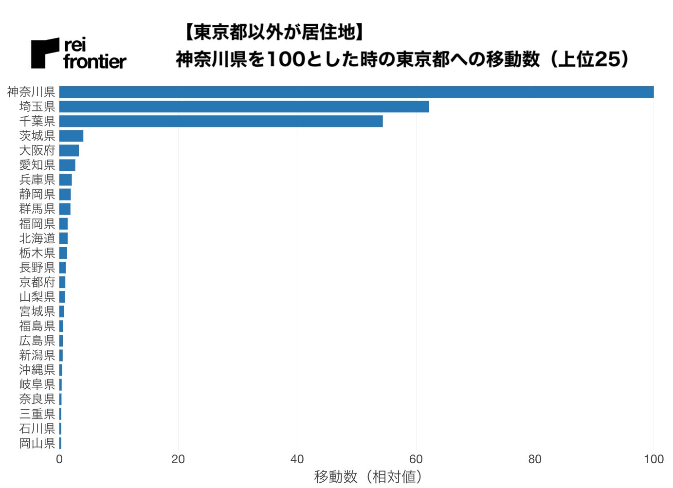 こちらは東京都以外が居住地と推定された方の東京都への移動数で、神奈川県を100とした時の東京都への移動数になります。