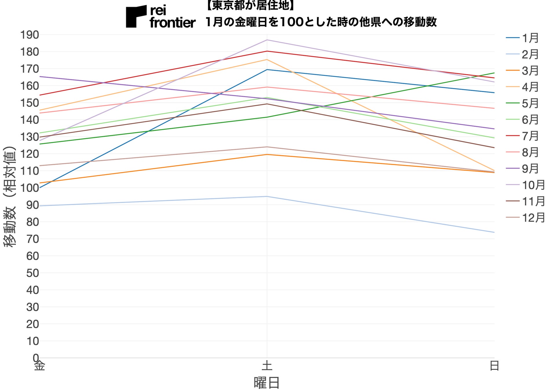 5月・9月以外は大小の差はありますが、土曜に移動数が増加し、日曜に移動数が減少する傾向を示しています。