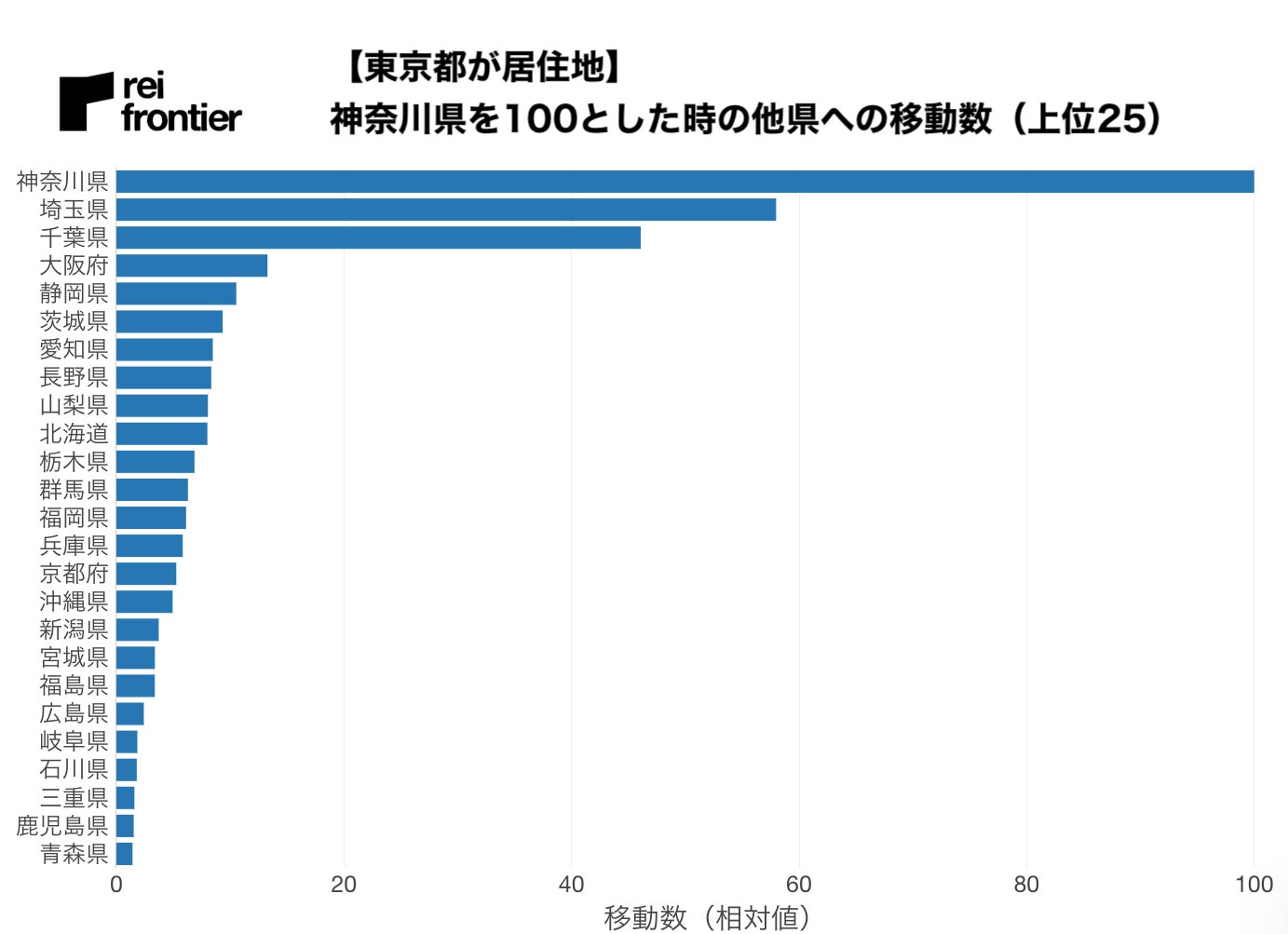 こちらは東京都居住と推定された方の神奈川県への移動数を100とした時の他県への移動数になります