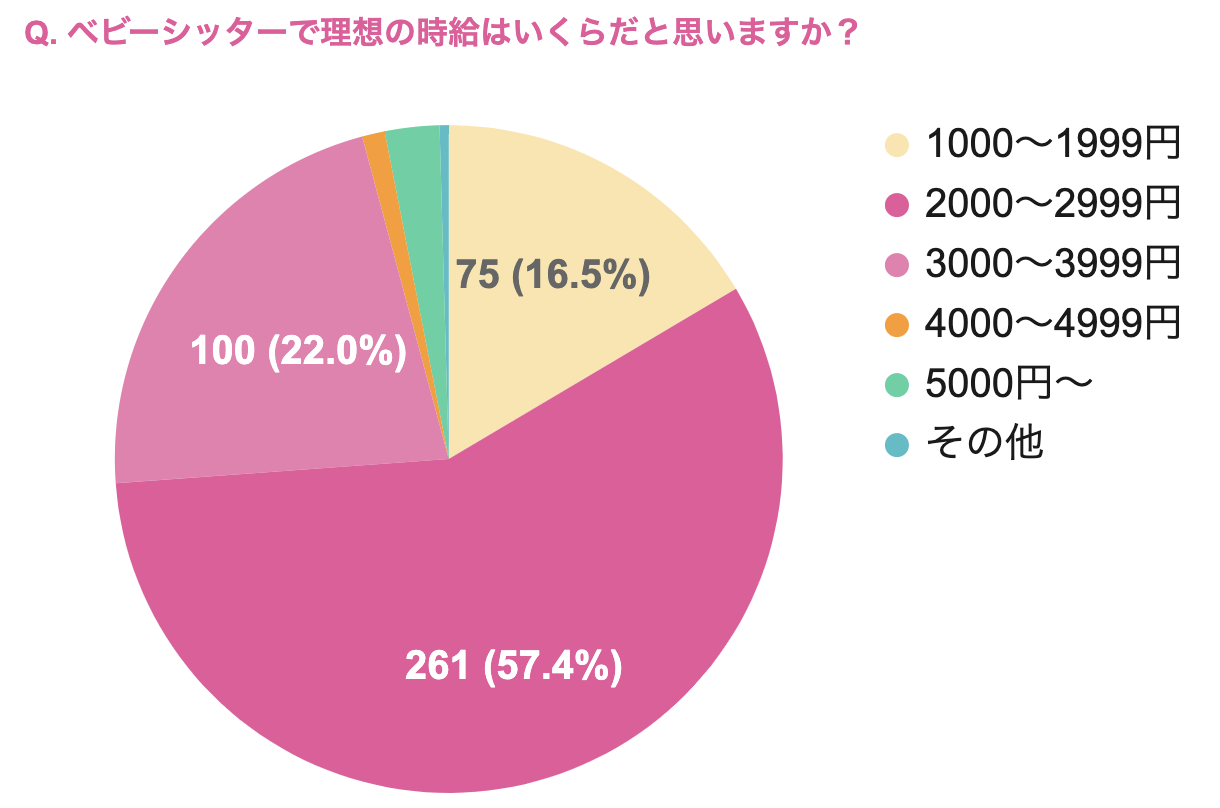 キッズラインで活動するサポーターにアンケートを行ったところ、保育士資格を保有する保育士サポーター455名のうち、「ベビーシッターで理想の時給はいくらだと思いますか?」の質問に対し「2,000円以上」と回答した保育士サポーターが378名(83.0%)という結果となりました。