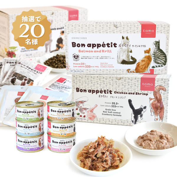 tamaオリジナル商品をご堪能いただける、ドライフードとウェットフード、口腔ケアに役立つサプリメントのセット。総額「12,213円相当」の贅沢なセットです。
