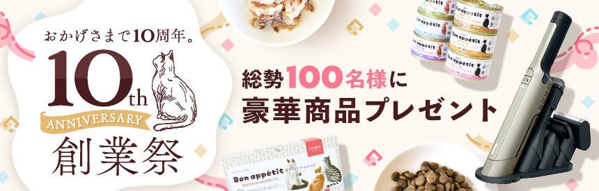 「tama」の誕生から10年。皆さまのご愛顧とかわいい猫たちに支えられ、成長を続けられていることに心からの感謝を込め、総勢100名様にプレゼントをご用意しました(抽選)。