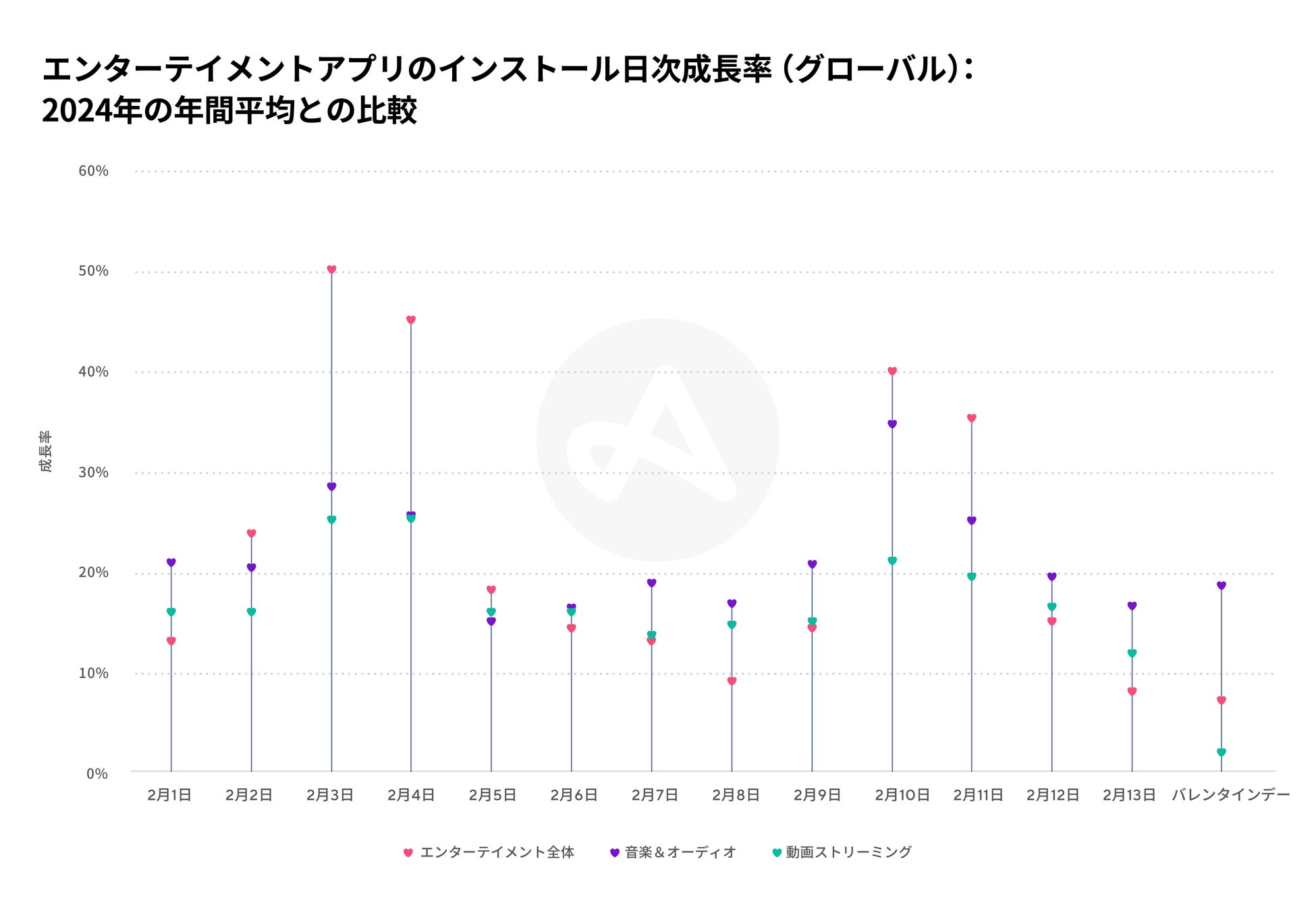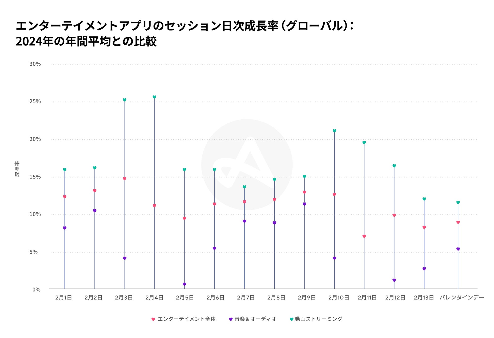 2月1日〜10日の間に、音楽とオーディオアプリのインストール増加率が最大となり、2月10日には35%以上に達しました。これは、ユーザーがバレンタインデーに向けてプレイリストを作成していた可能性が高いと考えられます。動画ストリーミングアプリも同様の傾向を示し、特にロマンス映画やテレビ番組への関心が高まった影響で、2月3日にはインストール数が25%増加し、2月10日には再び21%増加が見られました。また、セッション数も顕著に増加し、2月9日から13日にかけて10%以上増加した日が複数ありました。