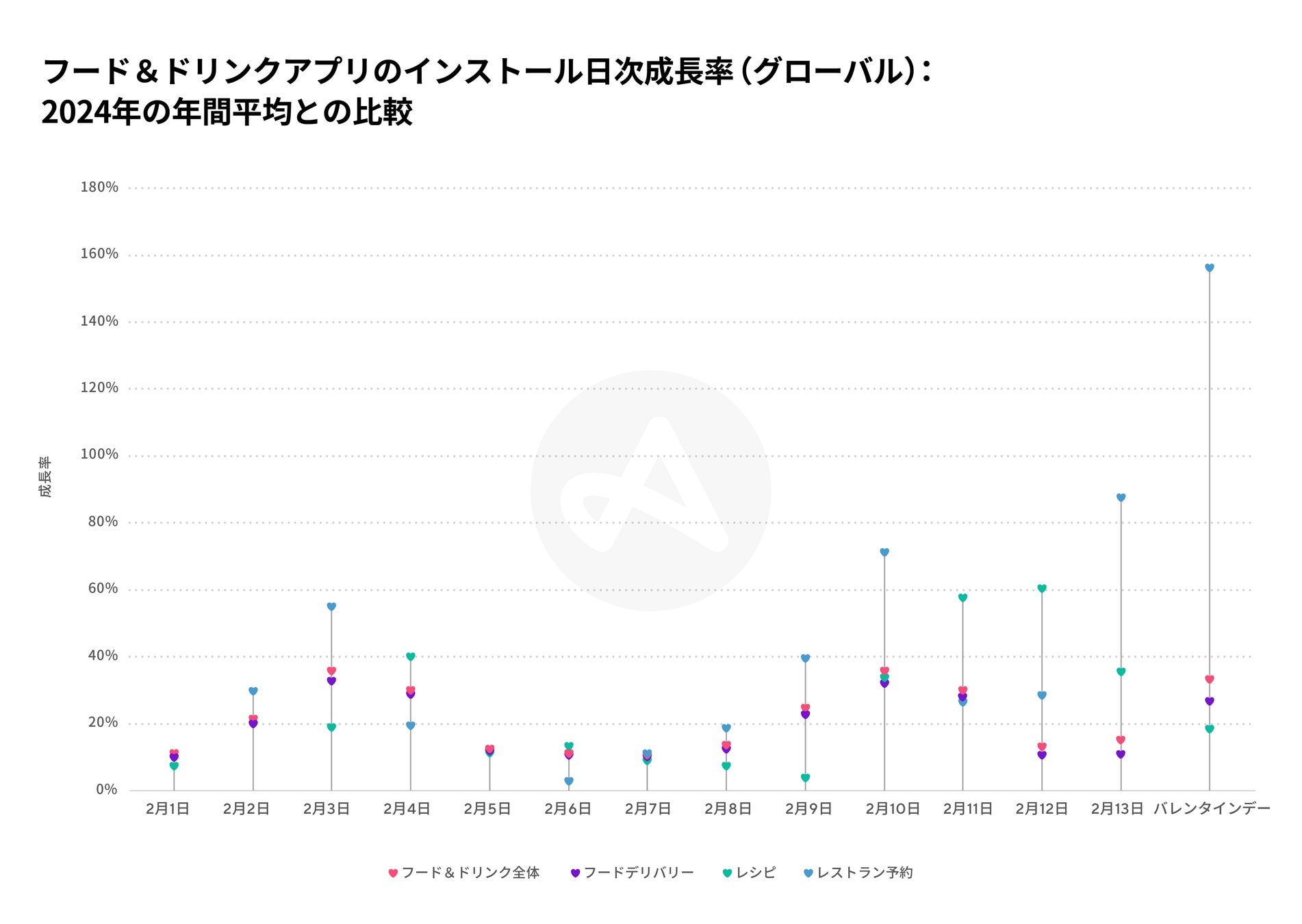 バレンタインデー当日、レストラン予約アプリのインストール数が156%増加し、多くのユーザーがディナーの予約を行ったことが分かりました。さらに、レシピアプリのインストール数も2月12日に60%増加しており、自宅で手料理を振る舞うことへの関心の高まりを示しています。また、フードデリバリーアプリのインストール数もバレンタインデー当日に27%増加し、自宅で食事を楽しむ傾向が強まっていることが分かります。