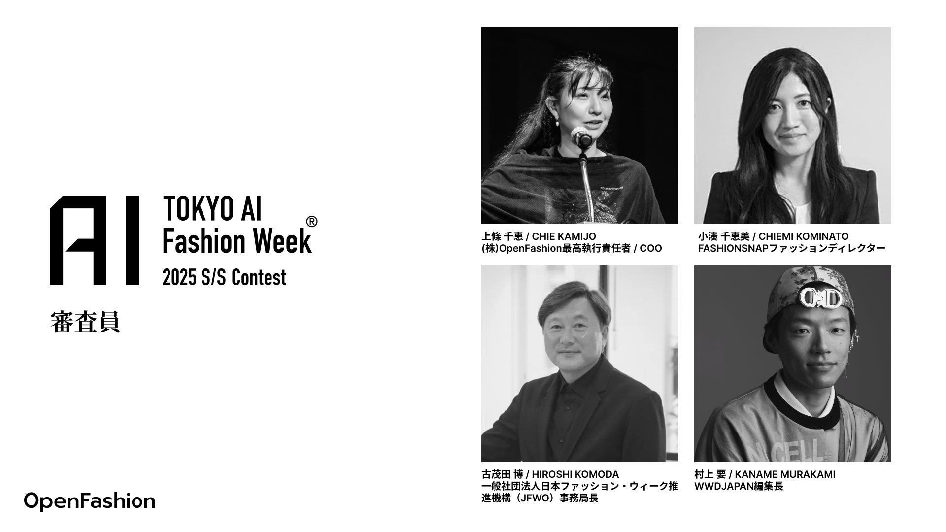 ファッションとAIを始めとした最新テクノロジーをかけ合わせたサービス・プロダクトの開発に取り組む株式会社OpenFashion(本社:東京都港区、代表:上田 徹、以下OpenFashion社)は、生成AIを活用したファッションデザインコンテスト「TOKYO AI Fashion Week - 2025 S/S Contest」の審査員に、WWDJAPAN編集長 村上 要氏、ファッションディレクターの小湊 千恵美氏、そして一般社団法人日本ファッション・ウィーク推進機構(以下JFWO)事務局長の古茂田 博氏が決定したことをお知らせします。