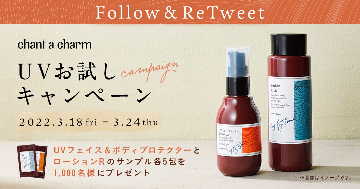 国産オーガニックスキンケア「チャントアチャーム 」のサンプルセットが1,000名様に当たる「UVお試しキャンペーン」を3/18(金)からスタート!