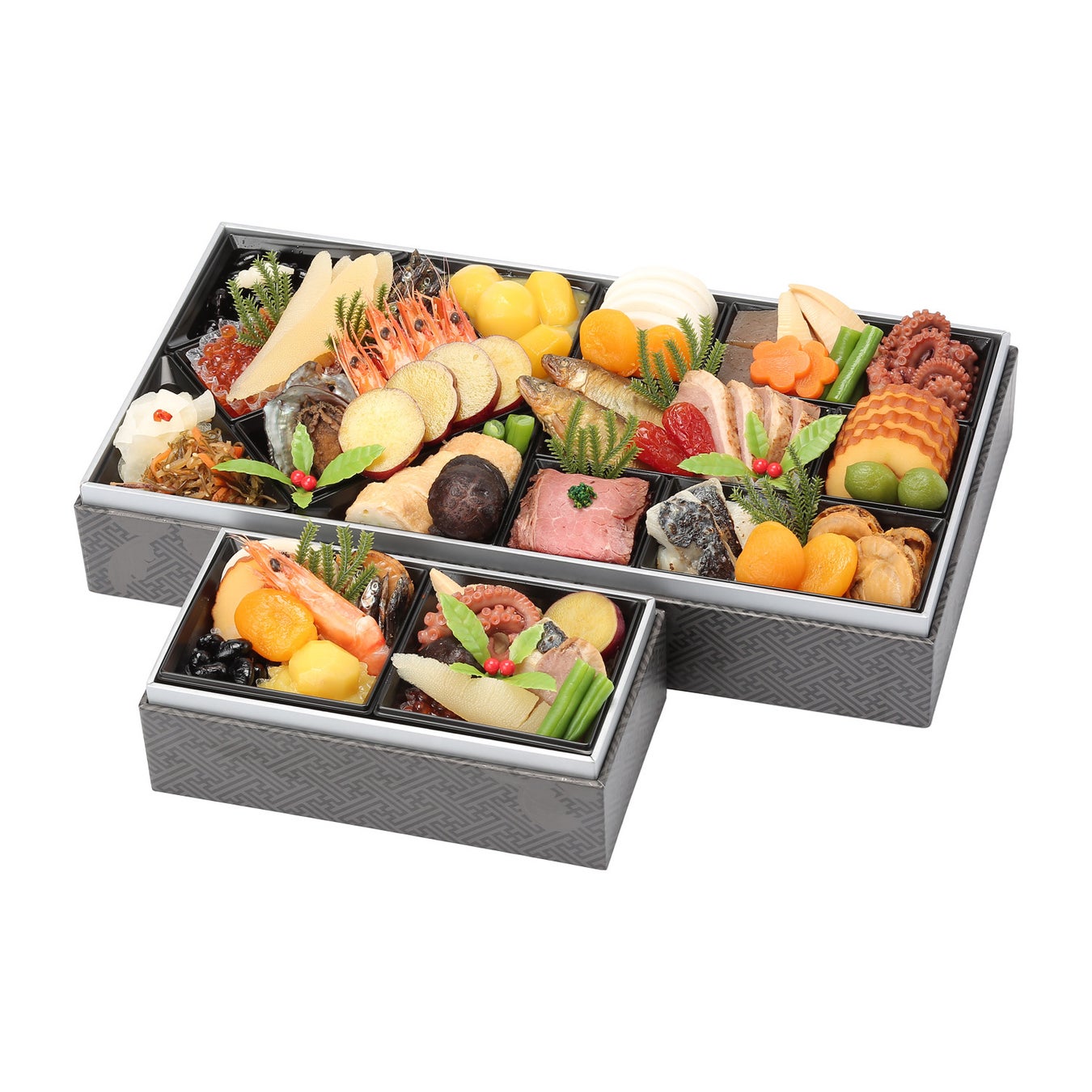 おせちには欠かせない25種の料理を詰めた「伝統おせち重」とお子さまも食べやすい料理を20種詰めた「親子重」の二段重です。来年の干支である「午(うま)」をモチーフにした食材も。華やかな盛り付けと、親しみやすさでお楽しみいただけます。