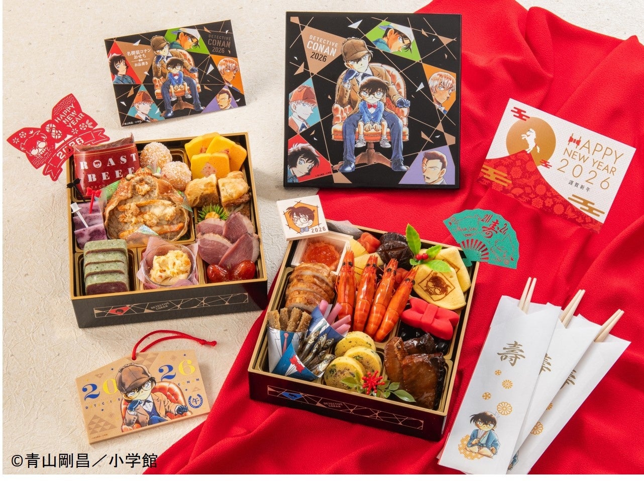 4年連続完売御礼の人気おせち。2026年は「探偵たちの饗宴(パーティー)と題し、『名探偵コナン』の魅力を存分に詰め込んだ大満足のおせちに、大ヒット上映中の最新映画『名探偵コナン 隻眼の残像』 から着想を得た献立も盛り込み、「見て楽しい、食べておいしい」工夫を凝らしました。このおせちでしか手に入らないオリジナルグッズも盛りだくさん。『名探偵コナン』の世界観がギュッと詰まったおせちです。