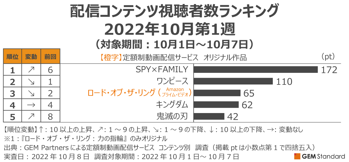 エンタテイメント業界に向けたデータ×デジタルマーケティングサービスを提供するGEM Partners株式会社(ジェムパートナーズ、所在地:東京都港区、代表取締役:梅津文)は10月14日(金)、複数の定額制動画配信サービスを横断して集計した2022年10月第1週の「配信サービス視聴者数ランキング(調査対象期間:10月1日~10月7日、調査対象:日本在住15~69歳男女)」を発表します。