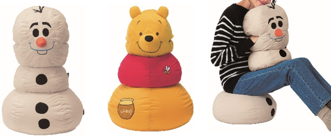 このほか、ビーズクッションとフェイス型クッションがセットになった「座って積んでうたた寝て。クッション3個セット」は、「くまのプーさん」「オラフ」の愛らしさもさることながら、座椅子、うたた寝クッションとして使える実用性も兼ね備えた優れもの。「ハグしてくれるつつ毛布」は、大好きなキャラクターにハグされたいというキャラクターファンの気持ちに応えた新タイプの商品です。