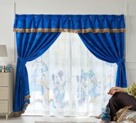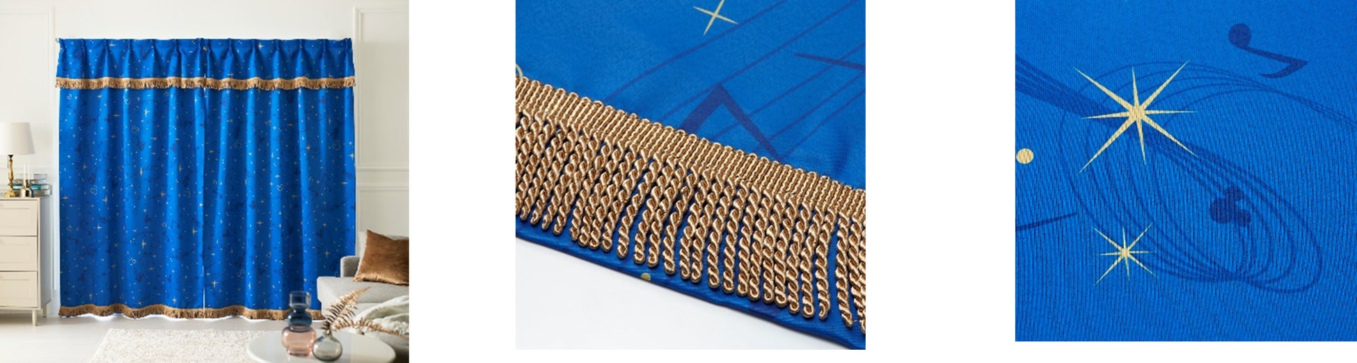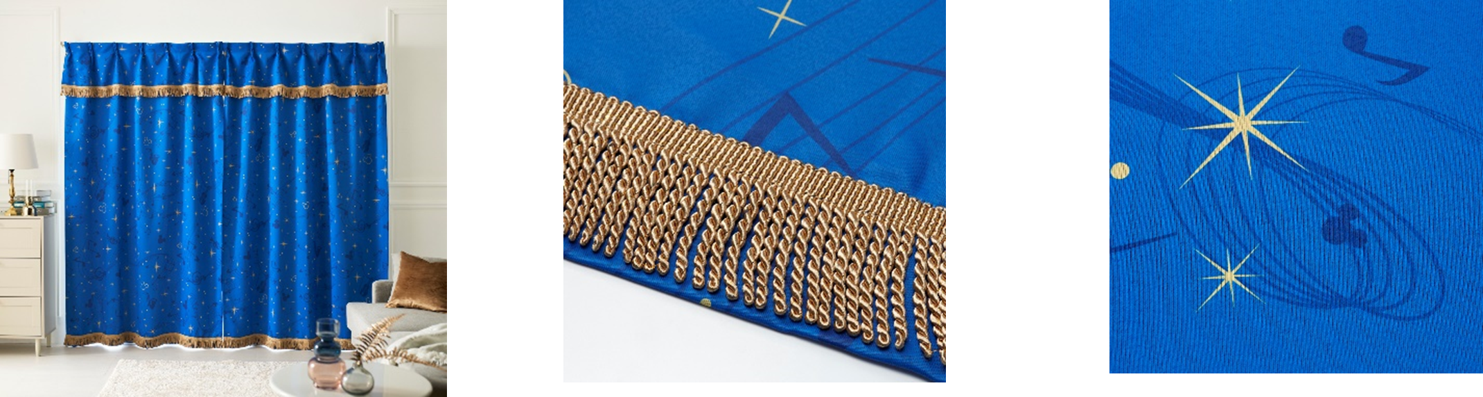 今回新登場する商品の中でも、とりわけ目を引くのが「緞帳のような遮光・遮熱カーテン「ミッキーモチーフ」」※、そして薄手カーテンの「一枚絵のようなUVカット・遮像・遮熱ボイルレースカーテン「ミッキー&フレンズ」」の2点で、設置するだけでお部屋の中にまるで舞台ができたかのような華のある商品です。カーテンを、舞台の前に垂らす幕である緞帳に見立てたデザインで、カーテンを開けるとまるで幕が上がりこれからショーが始まるようなワクワク感が生まれます。薄手カーテンは正装したミッキー&フレンズが勢ぞろいしたデザインになっており、2点を組み合わせて楽しんでいただけます。