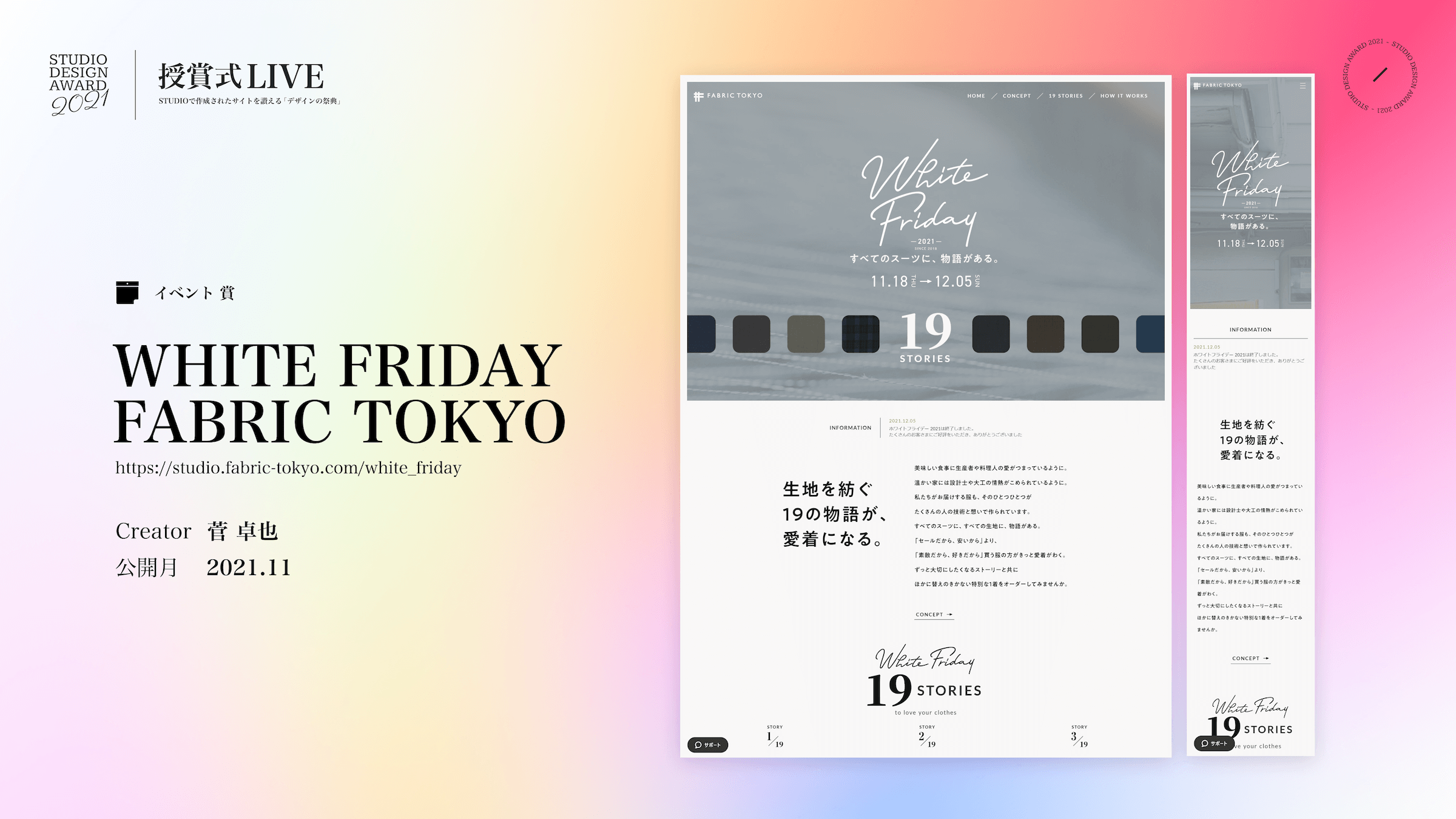 受賞サイト名:WHITE FRIDAY 2021 https://studio.fabric-tokyo.com/white_friday
