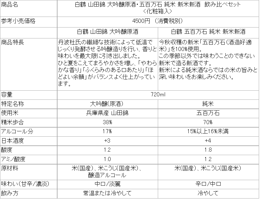 白鶴酒造株式会社は、白鶴直営店限定ブランド「御影郷」シリーズの冬季限定商品「白鶴 山田錦 大吟醸原酒・五百万石 純米 新米新酒 飲み比べセット」を、2022年12月5日(月)から公式オンラインショップで数量限定で発売します。