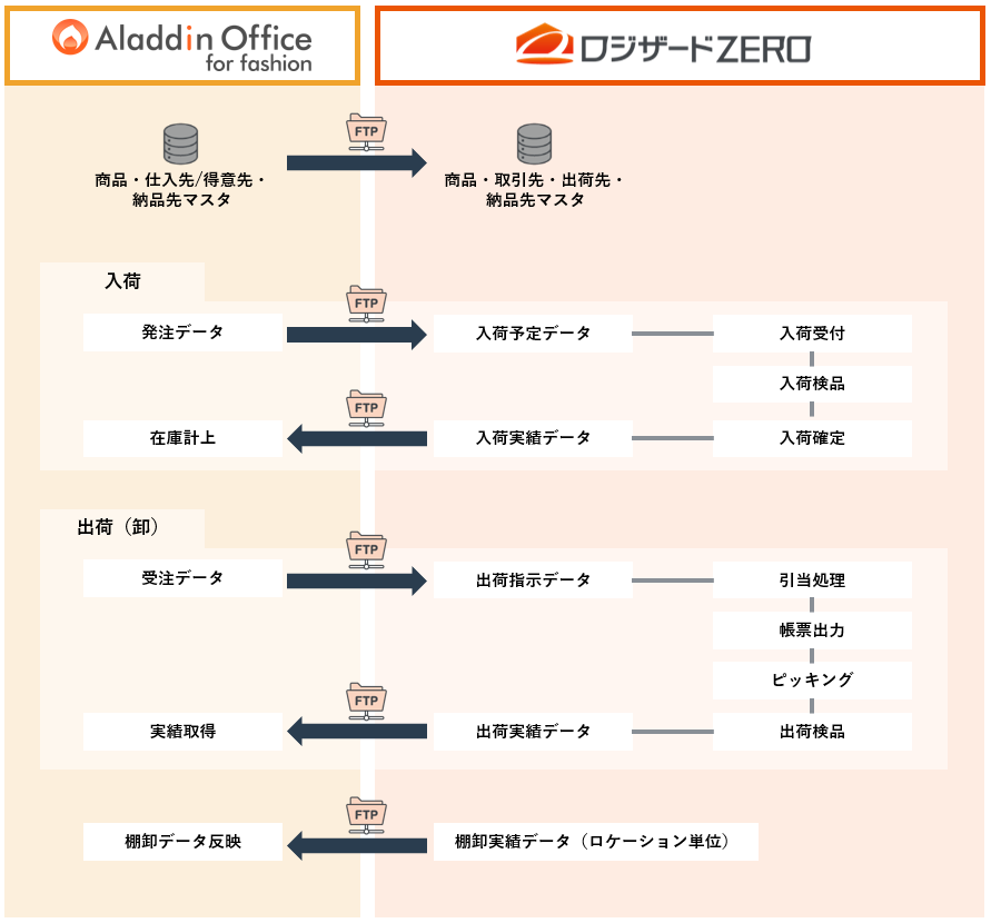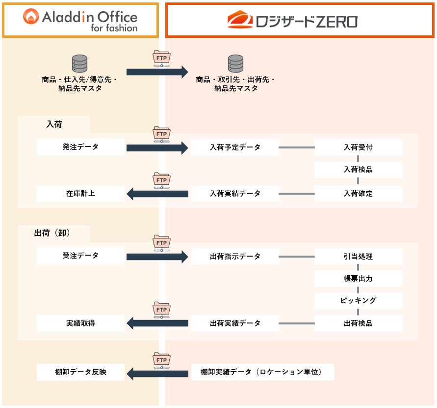 そこで、よりタイムリーな本部・倉庫間の連携を実現するべく、このたび「ロジザードZERO」は「アラジンオフィス for fashion」との連携を強化しました。これにより、「アラジンオフィス for fashion」と「ロジザードZERO」間の、各種マスタや、発注~入荷、受注~出荷、在庫におけるデータ連携が自動で可能になります。