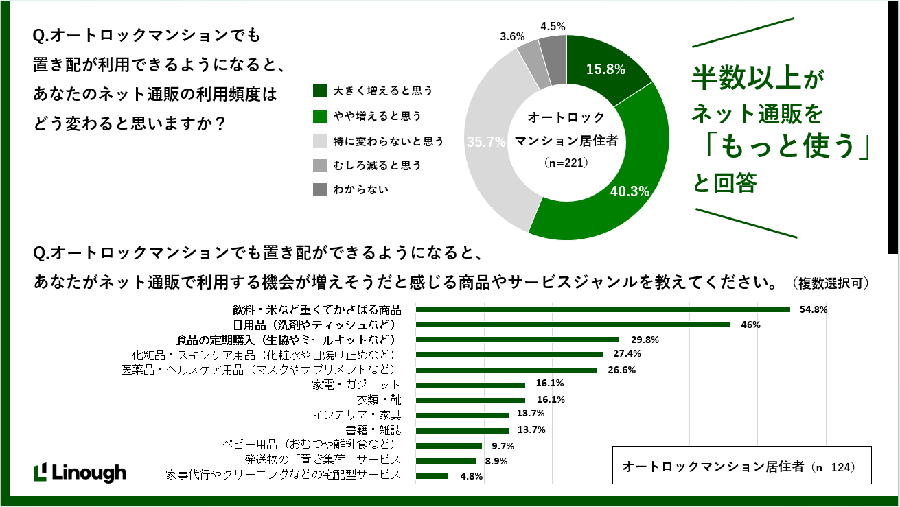 オートロックマンションで置き配が利用可能になった場合、ネット通販の利用頻度が増加すると回答した人は半数以上を占めました。利用機会が増える商品やサービスジャンルとして、飲料・米などの重くてかさばる商品や日用品(洗剤やティッシュなど)、食品の定期購入(生協やミールキットなど)が上位に位置しました。