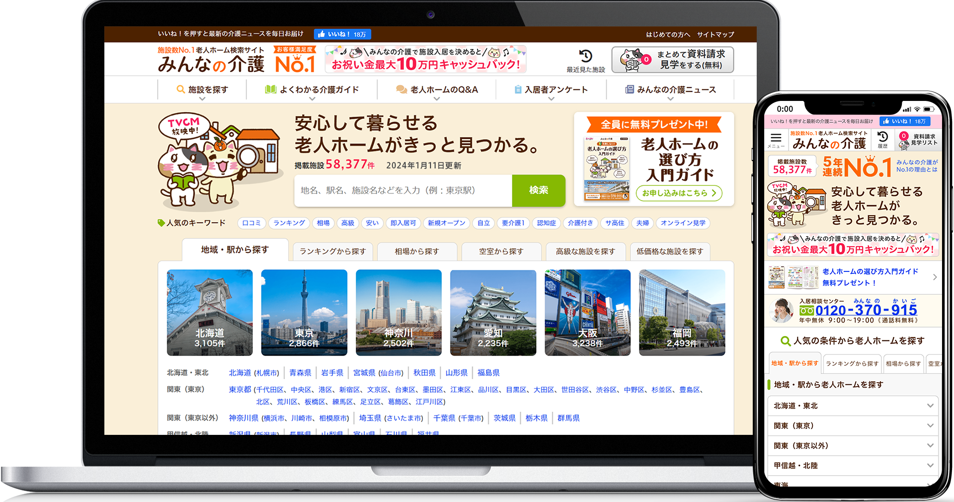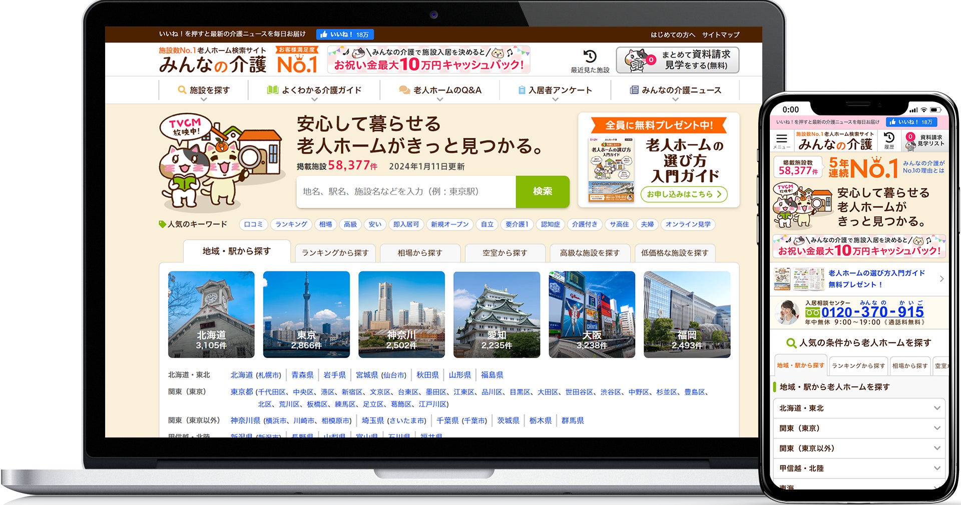 ※主要な老人ホーム検索サイトを対象に掲載施設数の調査を行った結果、みんなの介護がNo.1を獲得しました。