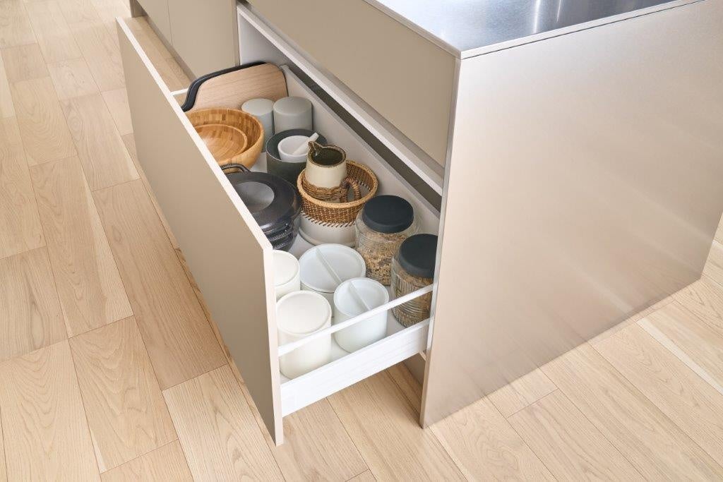 仕切り板がないので、お鍋やフライパン、ボウル類がすっきりと収まります。奥の収納物も簡単に取り出せる引き出し式です。