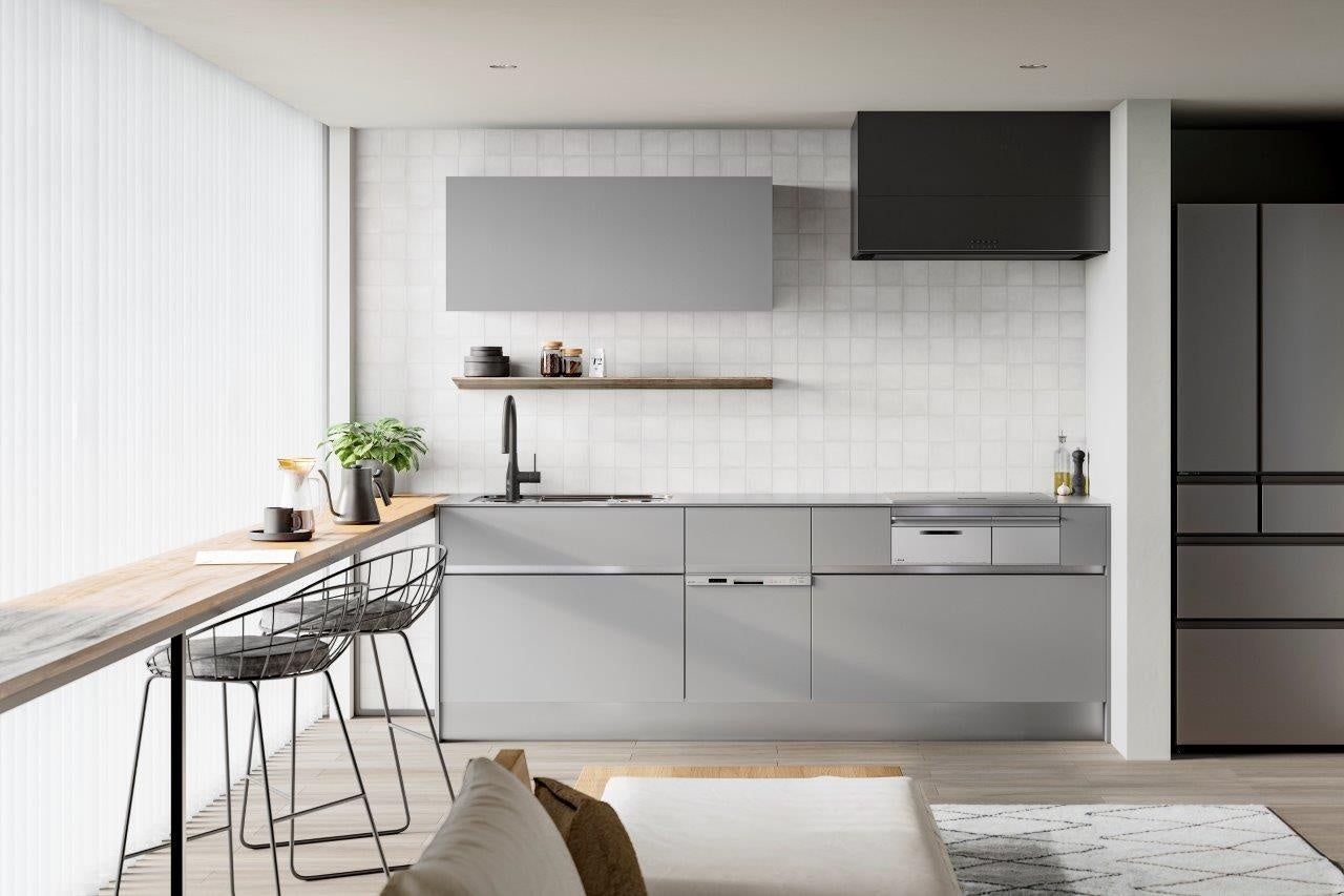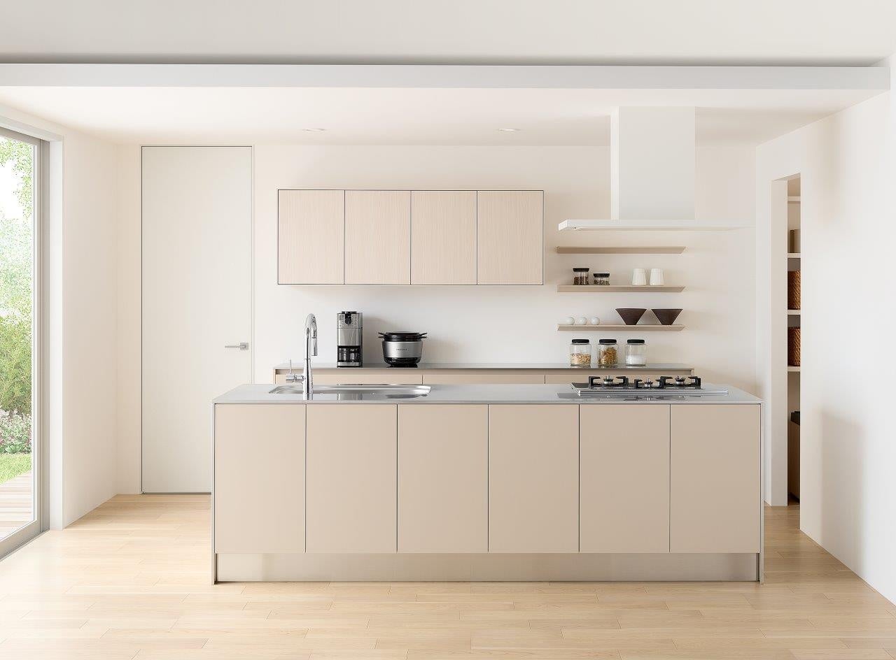 無駄な要素を一切省いたミニマルデザインと、トレンド感溢れるカラー展開が特長のシステムキッチンです。天板は「ステンレスヘアライン仕上げ」が標準仕様ですが、オプションで「ステンレスバイブレーション仕上げ」「人工大理石ホワイト」もお選びいただけます。扉の面材カラーは、定番のホワイト・ブラックに加え、近年の住宅内装のトレンドであるクレイベージュ・ミッドグレーを加えた4色展開です。主張しすぎないミニマルなデザインで、様々な住宅インテリアに溶け込み、空間を引き立てます。