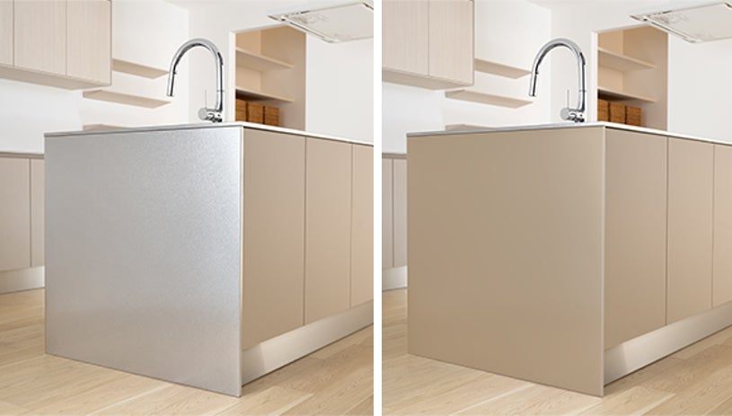 ステンレスの天板をご選択された場合、側面もステンレス同仕上げにすることができ、より一層スタイリッシュな印象となります。人工大理石の天板をご選択された場合は、扉の面材と同色仕上げとなります。