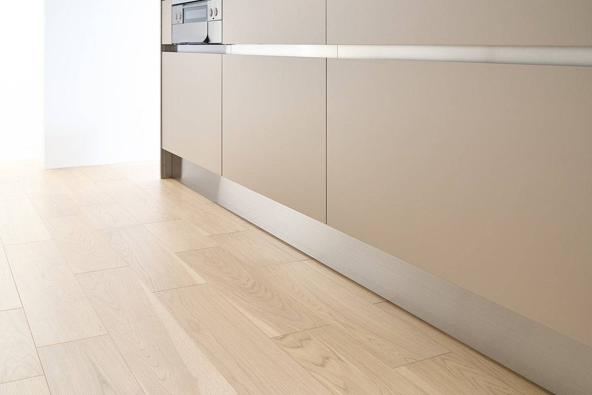 継ぎ目のない”通し巾木”で、足元まですっきりとしたデザインに仕上げました。巾木部分が内側に入り込んだ設計とすることで、使う人が一歩踏み込んだ楽な姿勢で調理できるよう配慮しています。