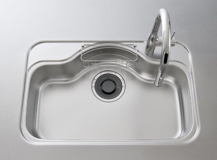 シンクは、幅750mmと幅の広いデザインを採用しました。標準で洗剤などを収納するバスケットが付属するため、小物の収納に便利です。