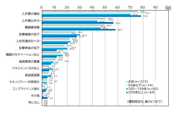「人件費の増加」・「人件費以外の経費の増加」と回答する病院が50%を超え、経費の高騰が病院の経営課題となっている。労働集約型産業である病院は人手不足が深刻で「職員確保難」と約50%の病院が回答している。