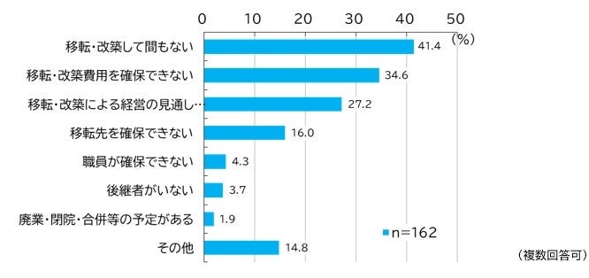 移転・改築済みとする病院が67病院(41.4%)ある一方、経営状況悪化・将来見通しが立たない とそれぞれ約30%病院が回答した。