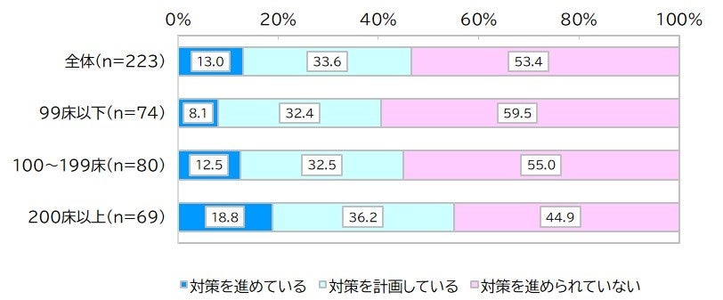 「対策を進めている」と回答したのは13.0%にとどまり、「対策を計画している」(33.6%)・対策を進められていない」(53.4%)との回答が87.0%を占め、病院が将来に向けた対策が進んでいない様子が伺えた。
